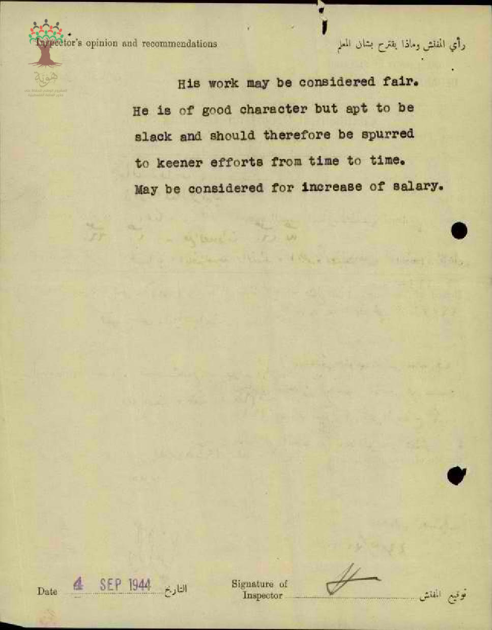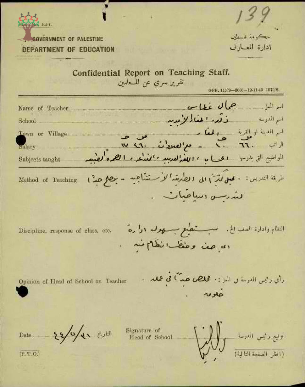 تقرير تفصيلي عن أداء المعلم جمال غطاس في مدرسة المغار سنة 1944