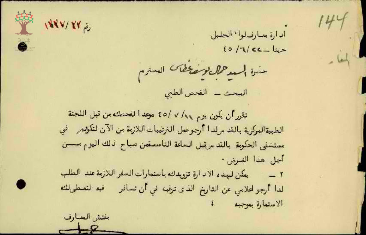 رسالة من مفتش المعارف إلى المعلم جمال غطاس يعلمه بقرار وموعد فحصه الطبي في القدس