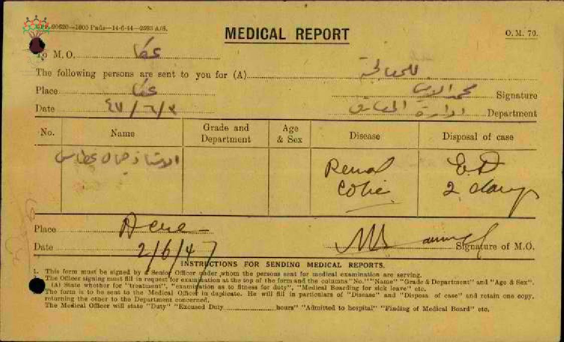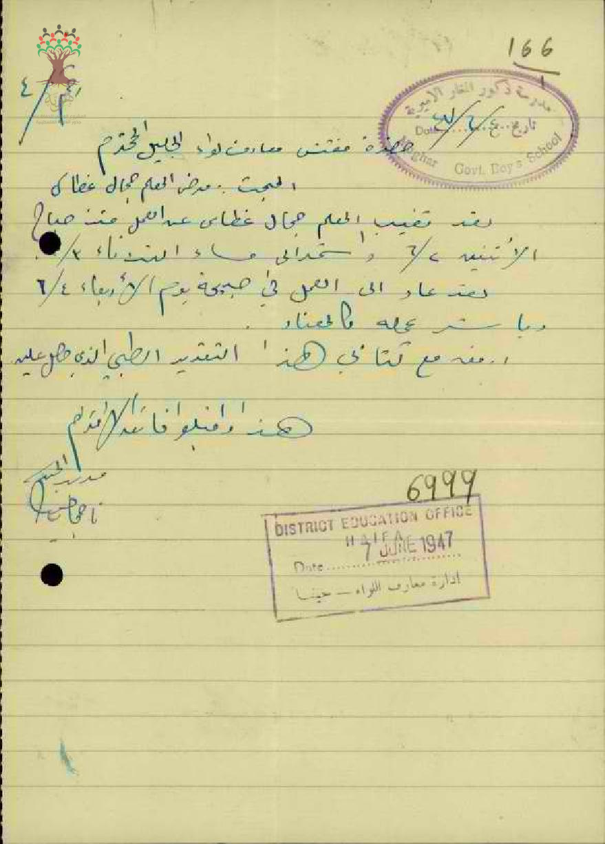 رسالة من مدير مدرسة المغار إلى مفتش المعارف يخبره عن غياب المعلم جمال غطاس عن العمل في 1947/6/2, وعودته إلى العمل في 1947/6/4 مرفقاً التقرير الطبي