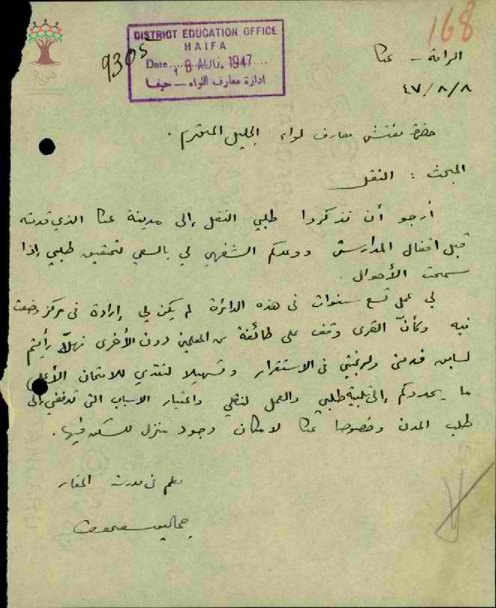 رسالة من المعلم جمال غطاس إلى مفتش المعارف يطلب منه نقله إلى مدينة عكا