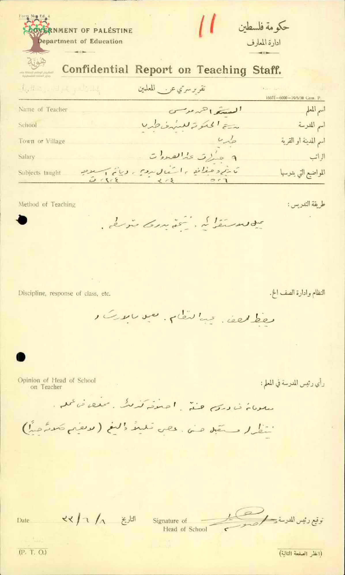 تقرير تفصيلي عن أداء المعلم أحمد موسى في مدرسة طبريا سنة 1933