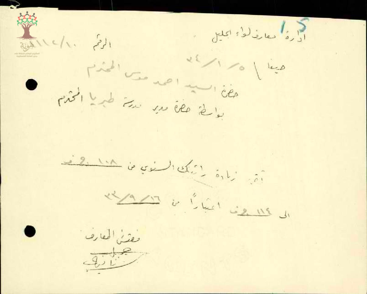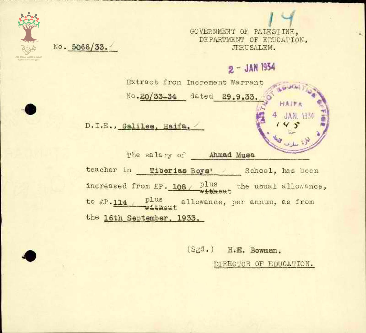 رسالة من مفتش المعارف إلى المعلم أحمد موسى يخبره بزيادة راتبه السنوي