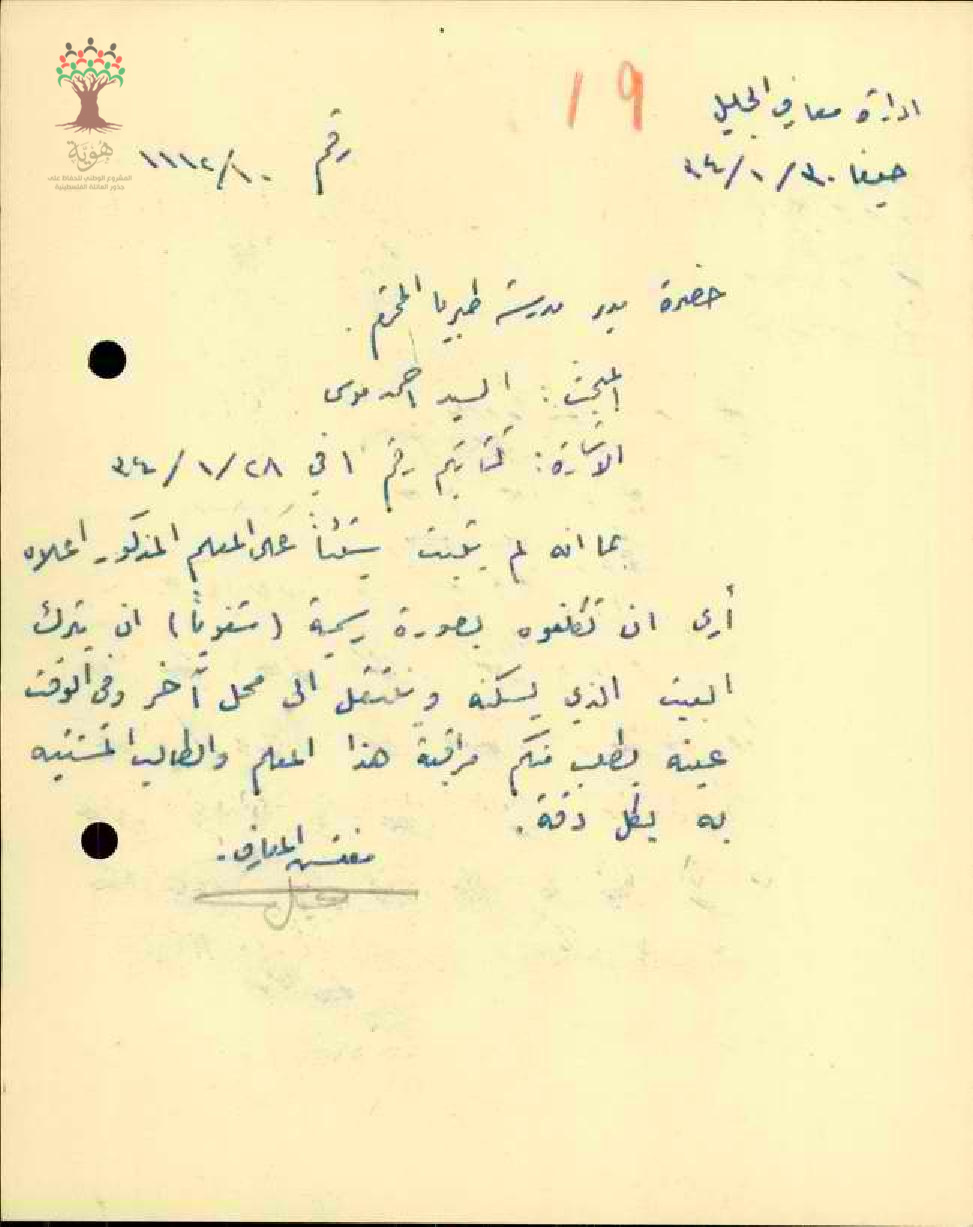 رسالة من مفتش المعارف إلى مدير مدرسة طبريا يخبره أنه لم يثبت شيئاً على المعلم أحمد موسى ويرى أن يكلف شفهياً بترك سكنه