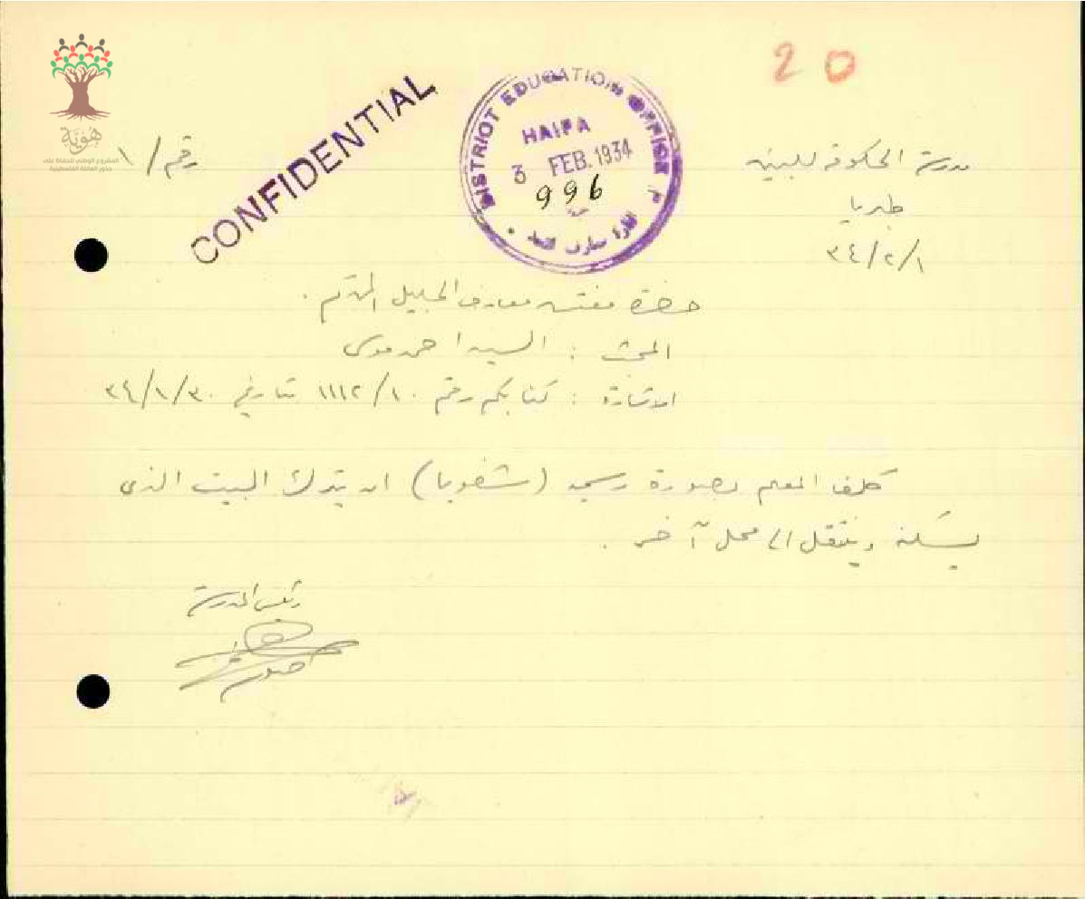 رسالة من مدير مدرسة طبريا إلى مفتش المعارف يخبره أنه تم تكليف المعلم أحمد موسى ترك سكنه وينتقل إلى محل آخر
