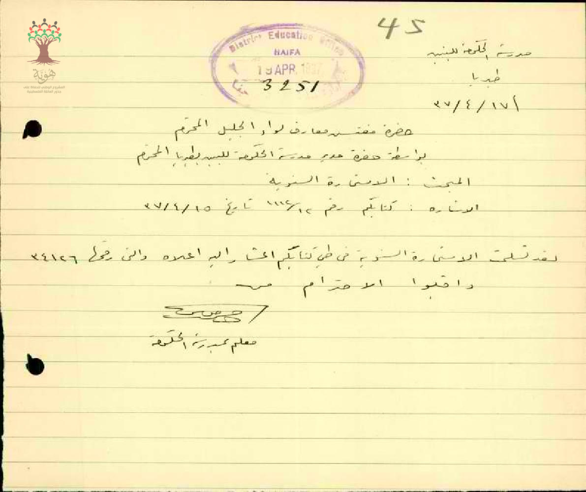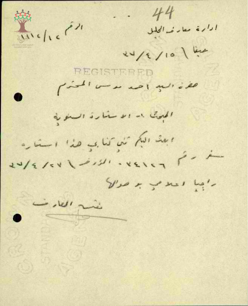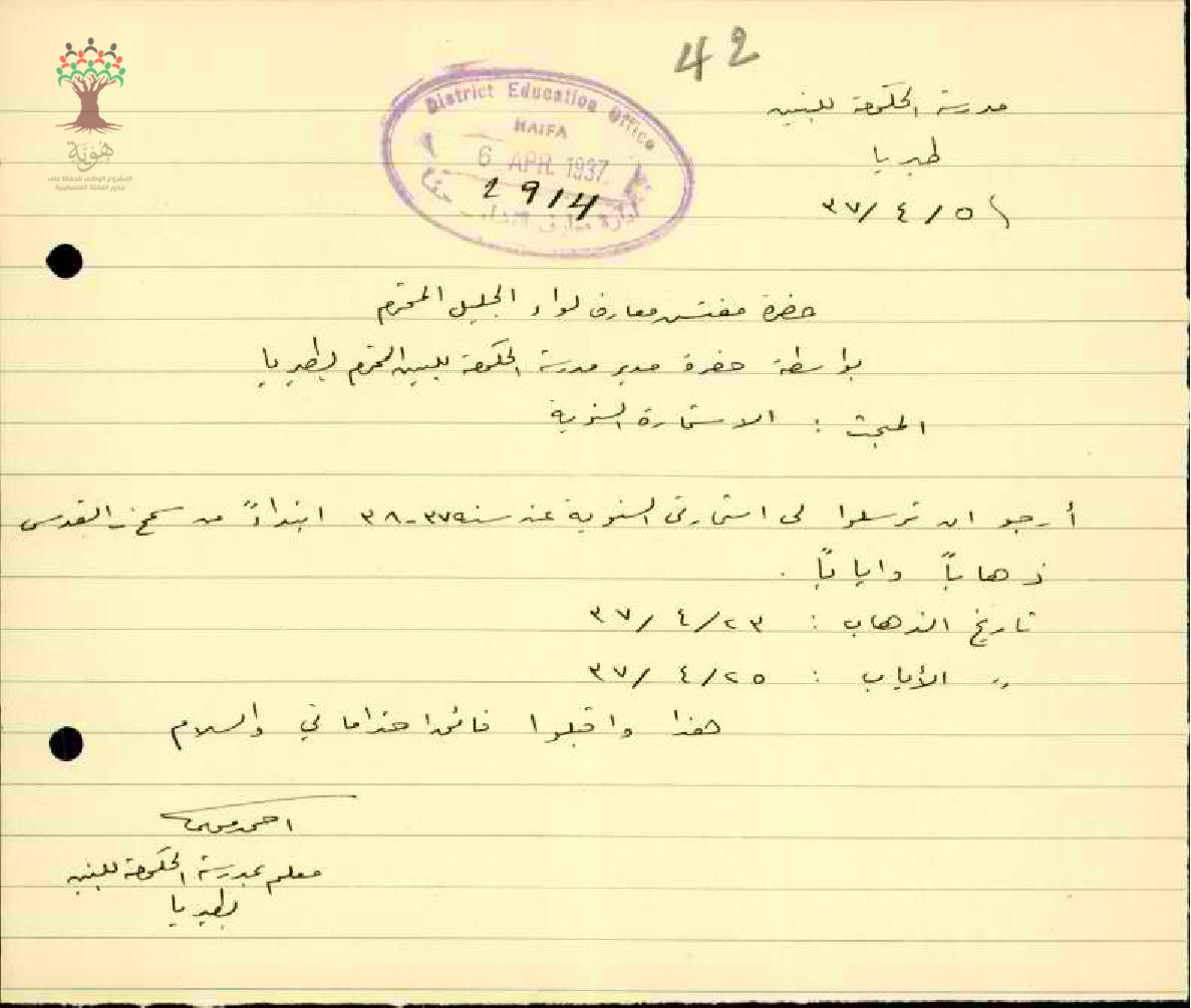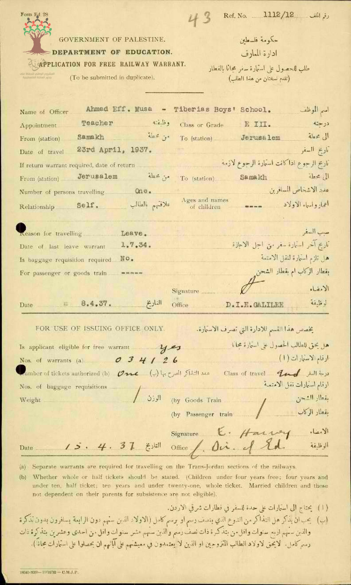 طلب للحصول على استمارة سفر مجاناً بالقطار للمعلم أحمد موسى سنة 1937
