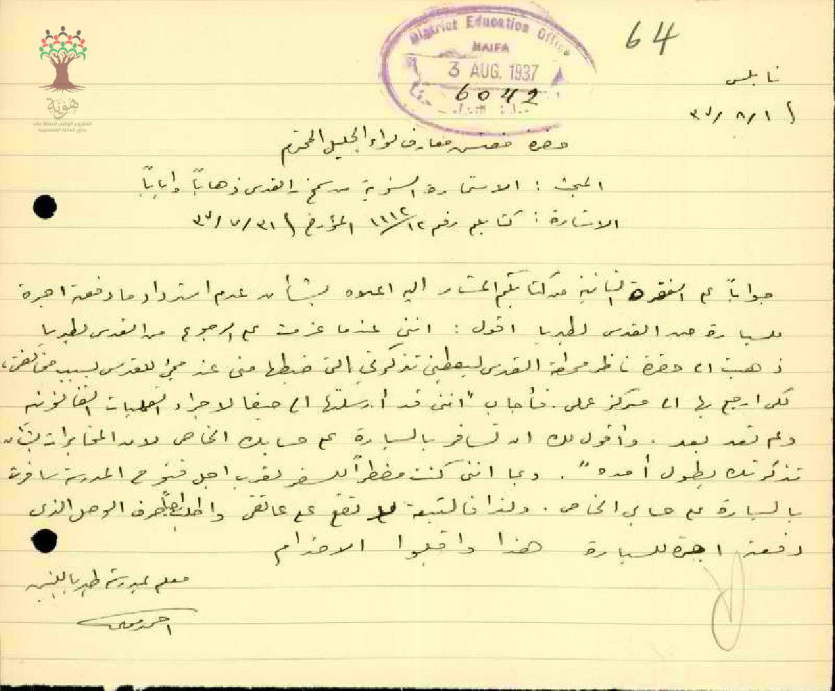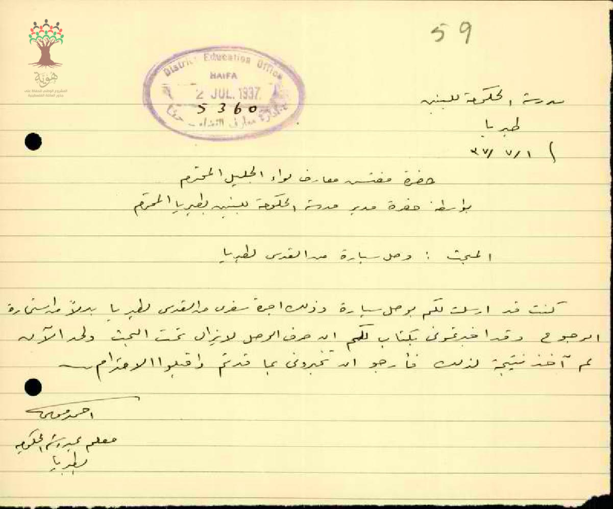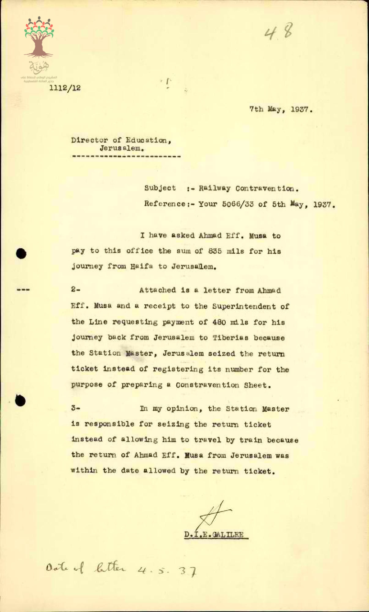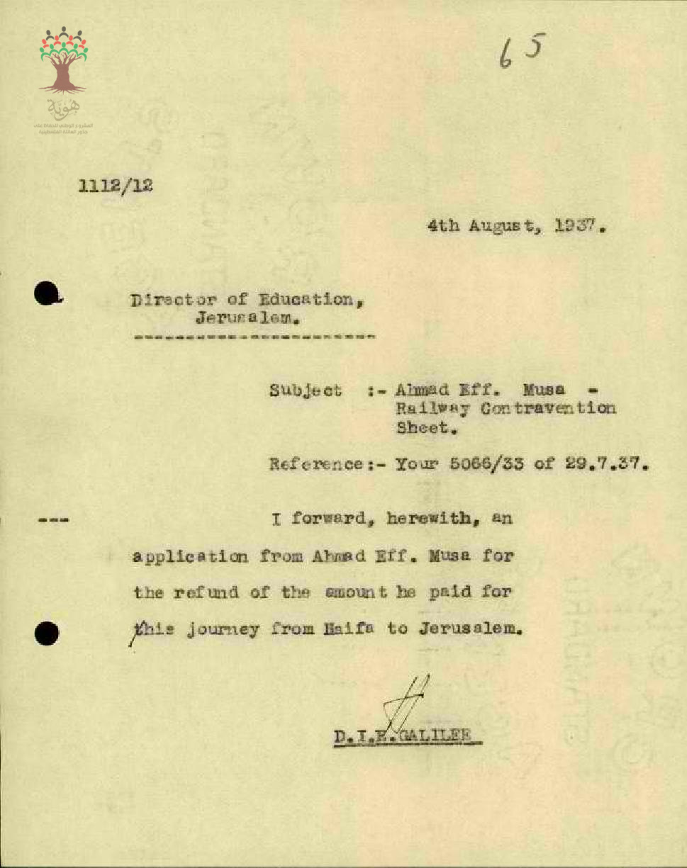 رسالة من مفتش المعارف إلى المعلم أحمد موسى يبحث معه مخالفة السفر بالقطار بعد فوات تاريخ الاستمارة