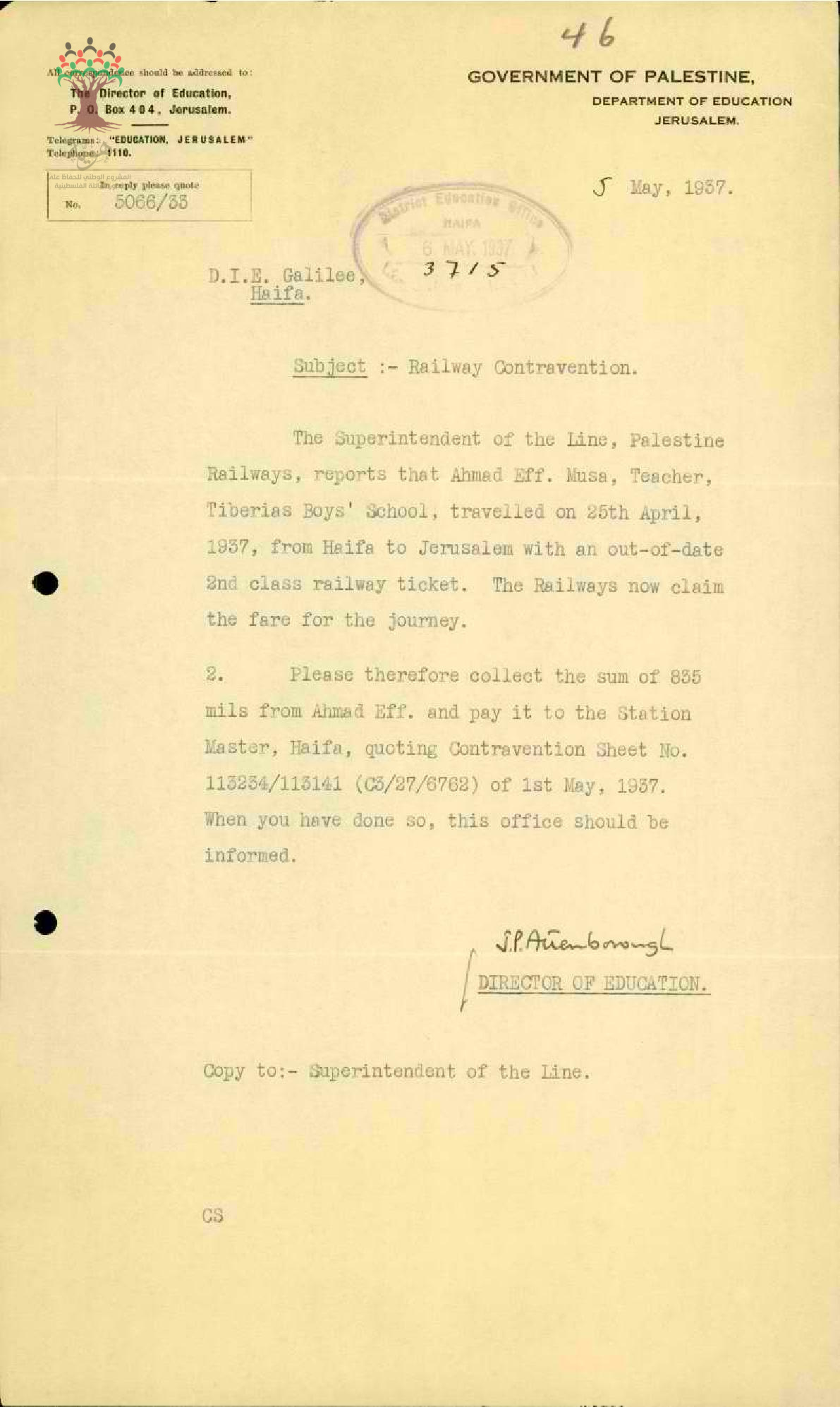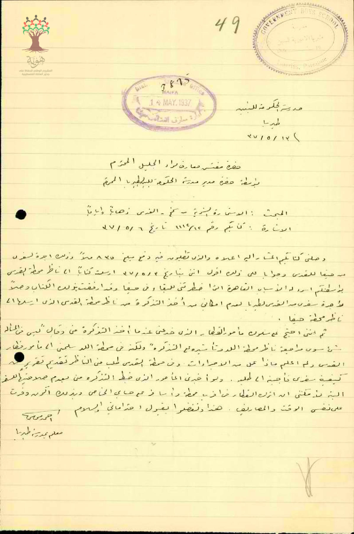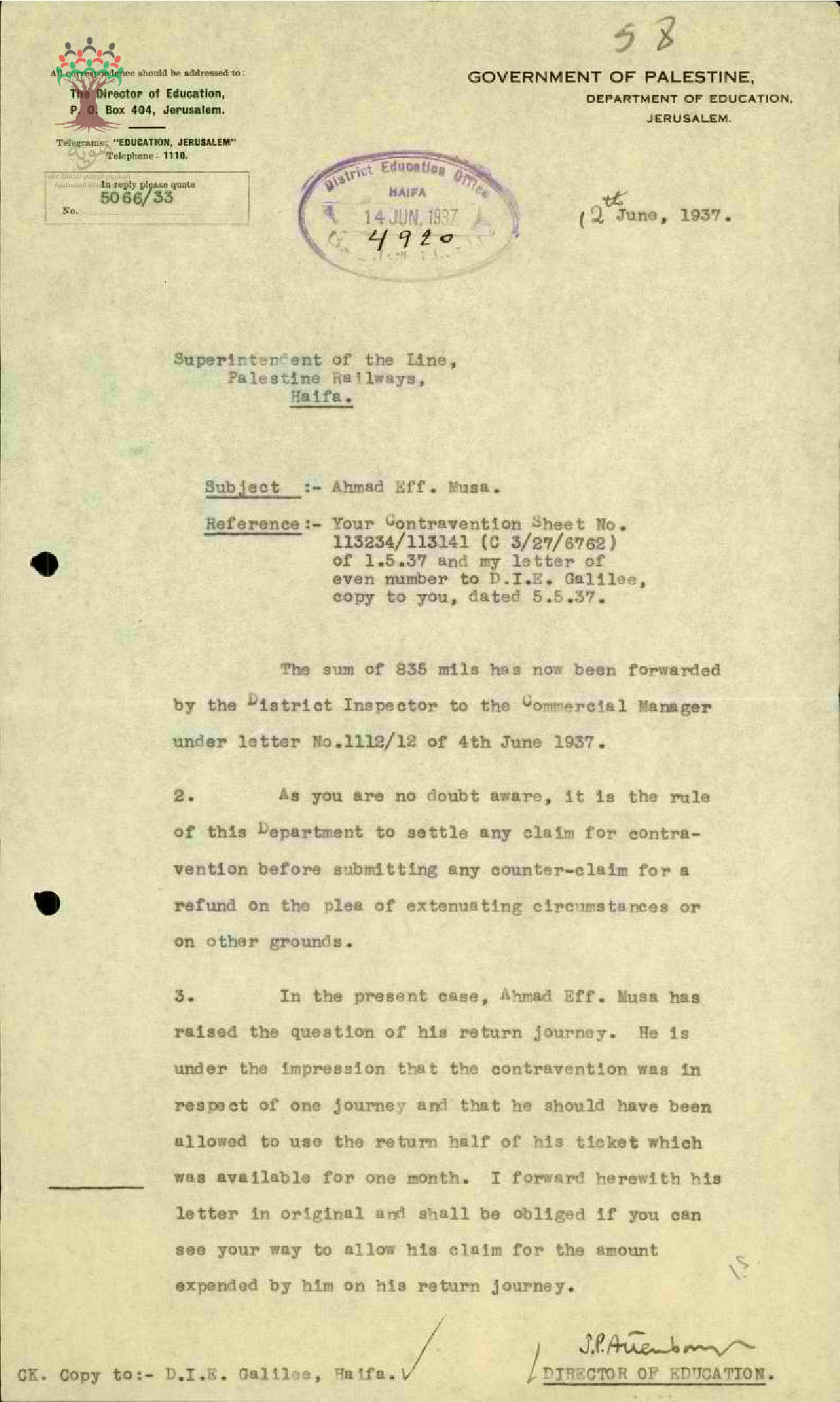 رسالة من مفتش المعارف إلى المعلم أحمد موسى يبحث معه مخالفة السفر بالقطار بعد فوات تاريخ الاستمارة