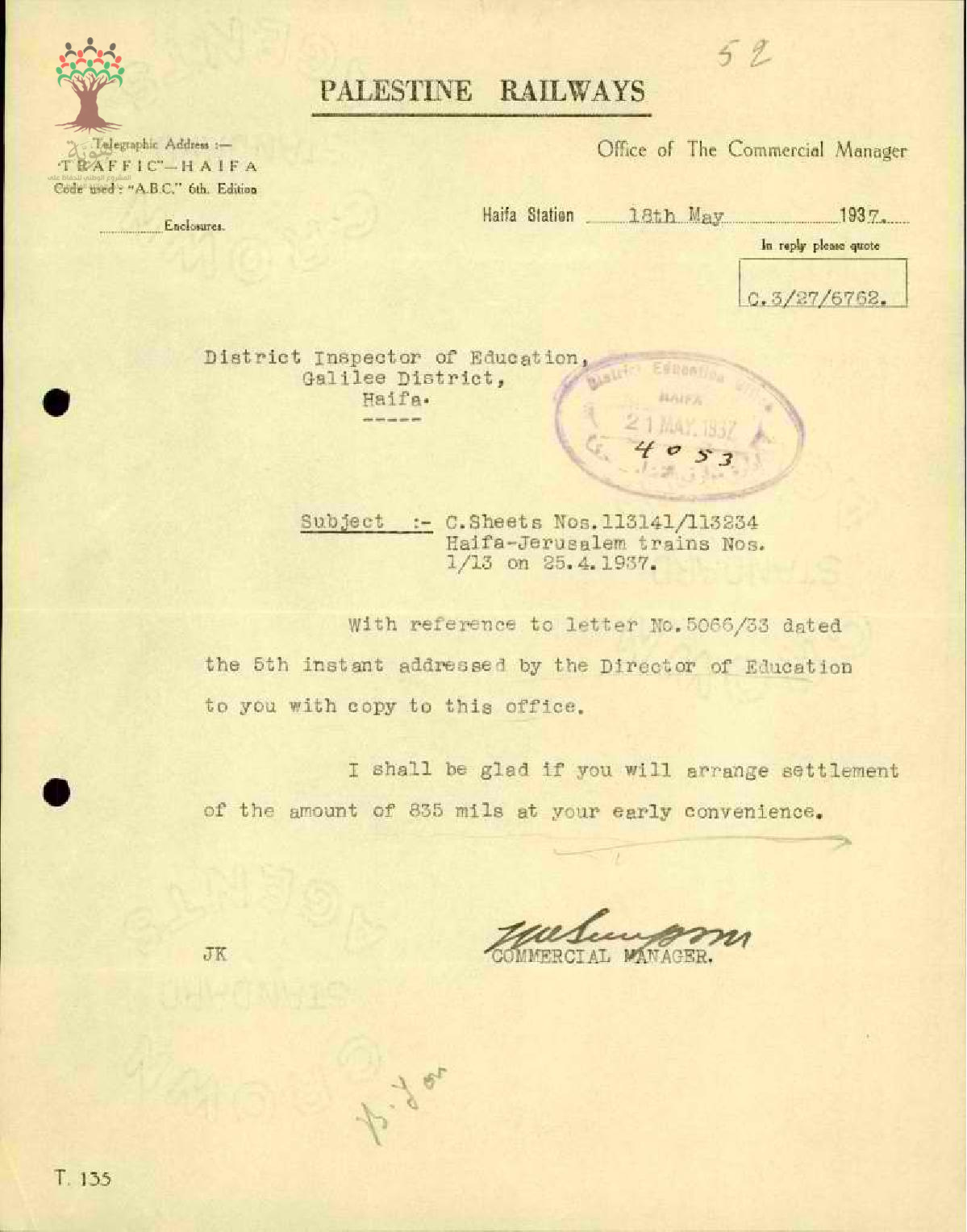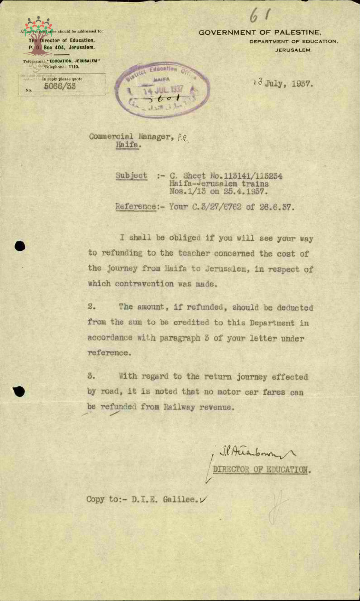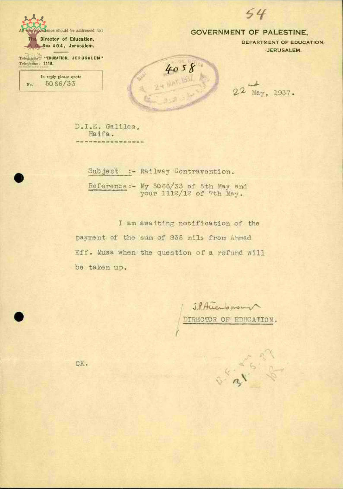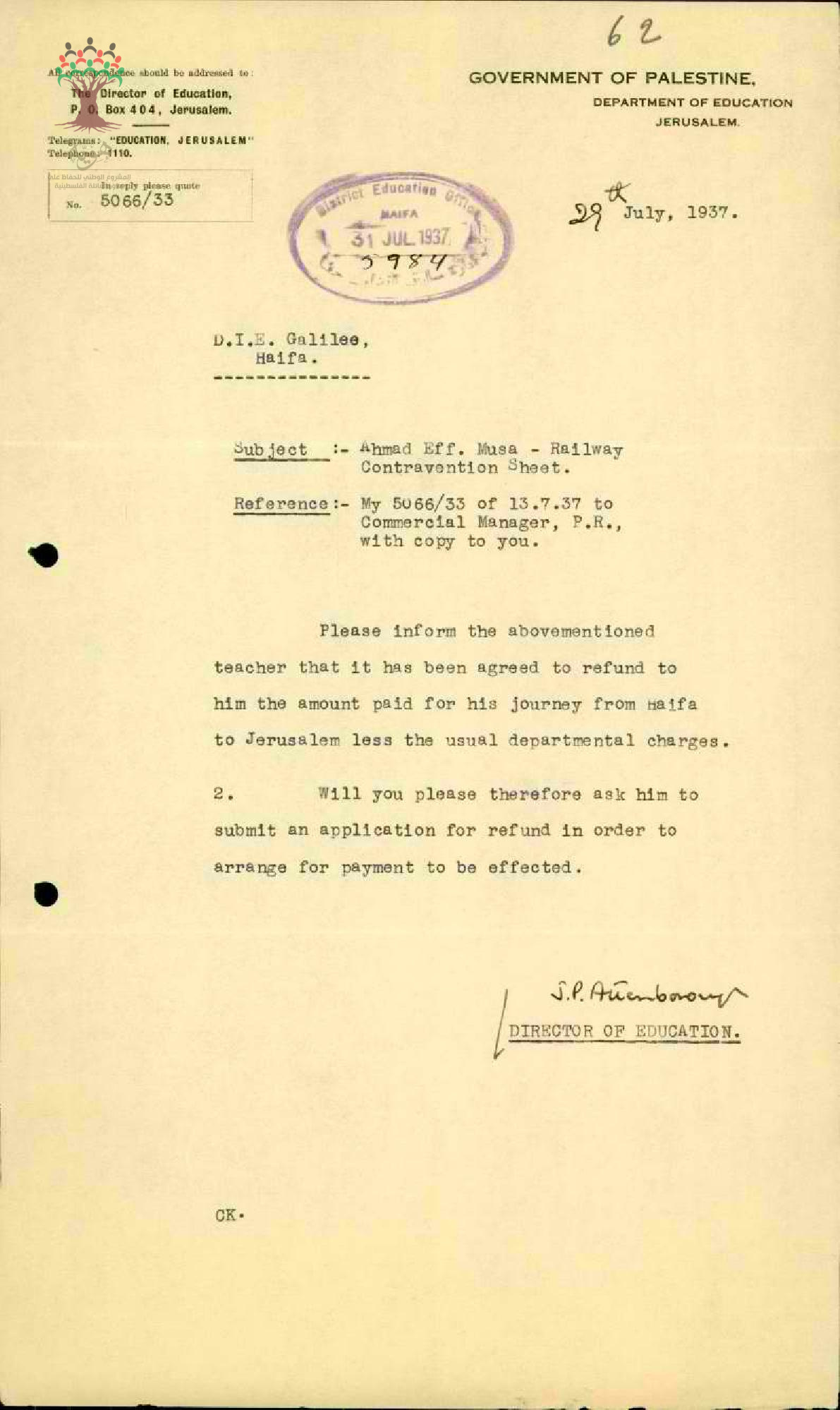 رسالة من مفتش المعارف إلى المعلم أحمد موسى يبحث معه مخالفة السفر بالقطار بعد فوات تاريخ الاستمارة