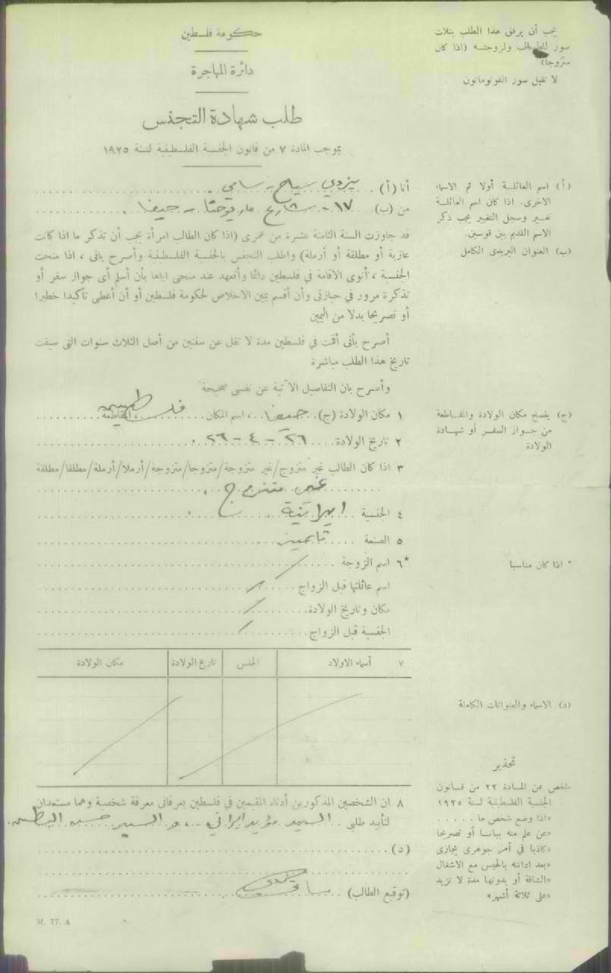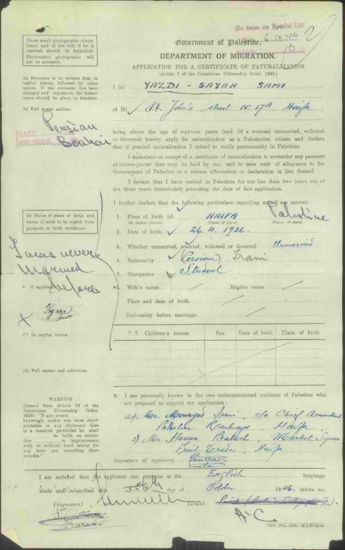 طلب الجنسية الفلسطينية-سامي يزدي سياح-حيفا/إيران