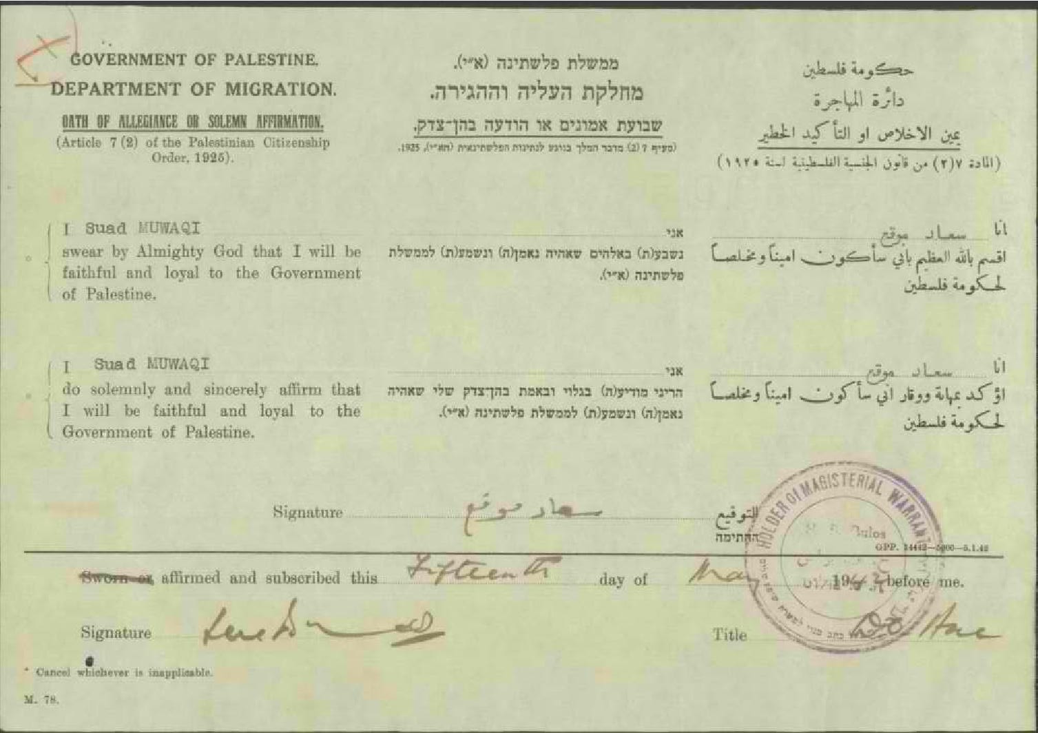 سعاد موقع توقع على (يمين الإخلاص) للحصول على الجنسية الفلسطينية