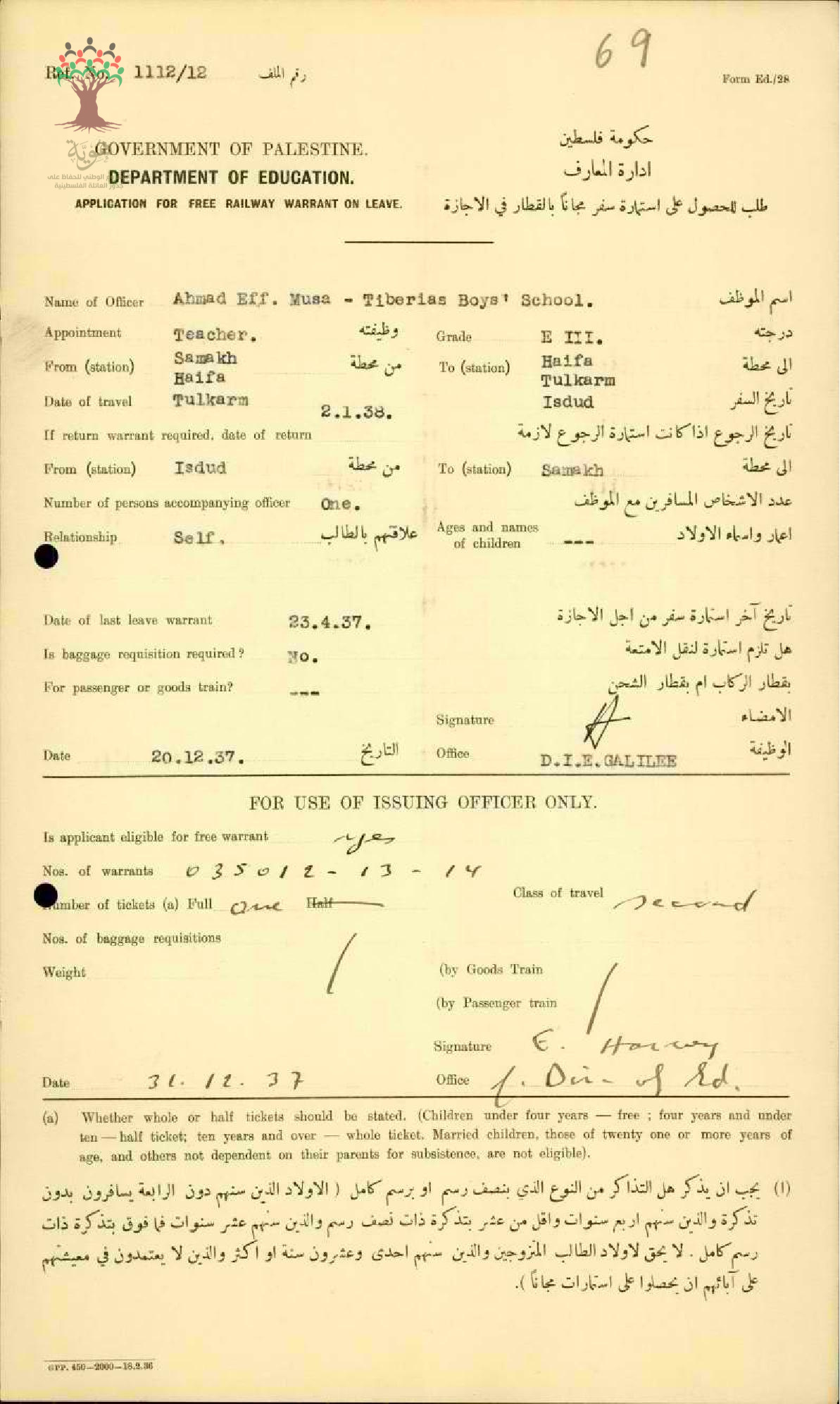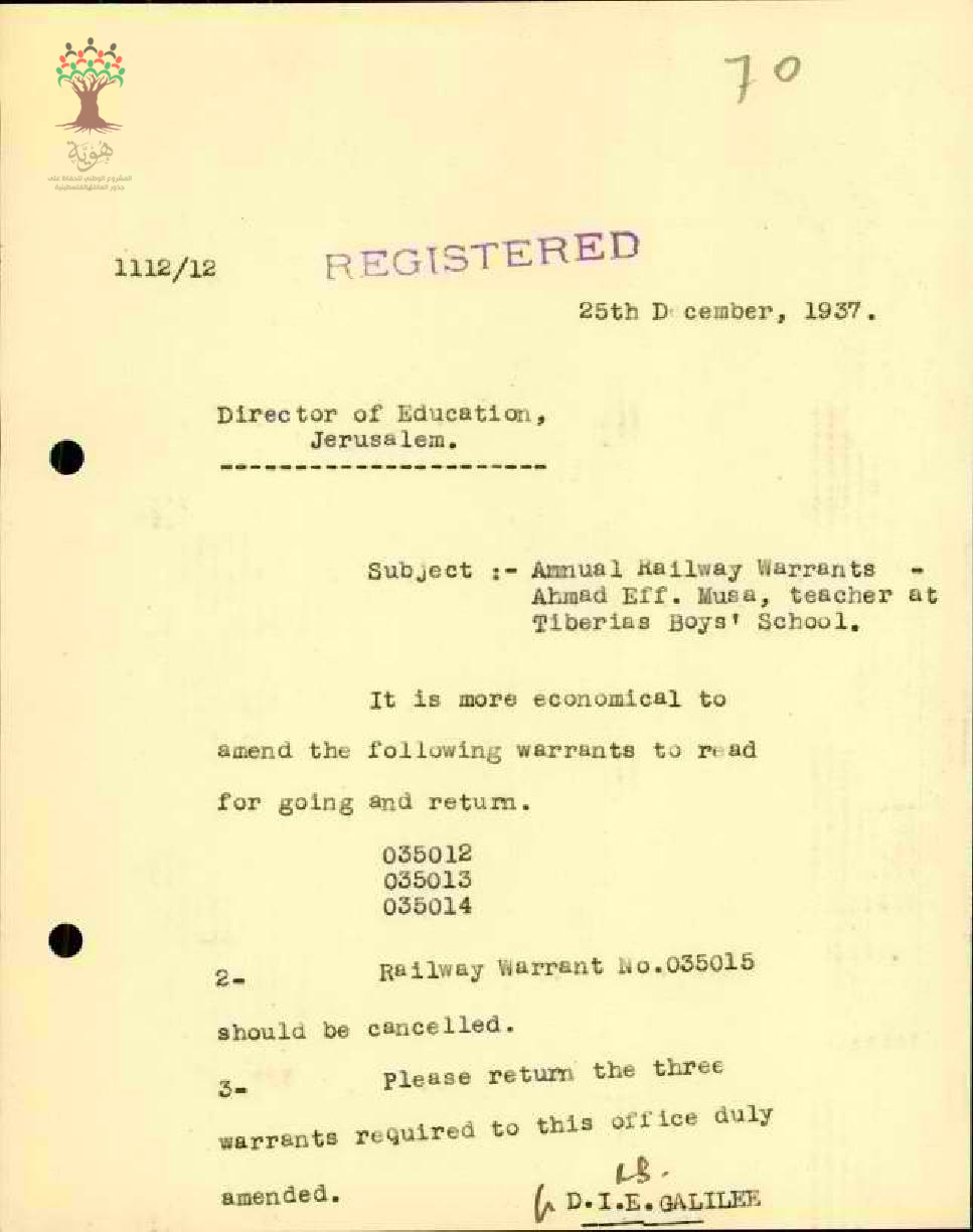 طلب للحصول على استمارة سفر مجاناً بالقطار في الإجازة للمعلم أحمد موسى سنة 1937