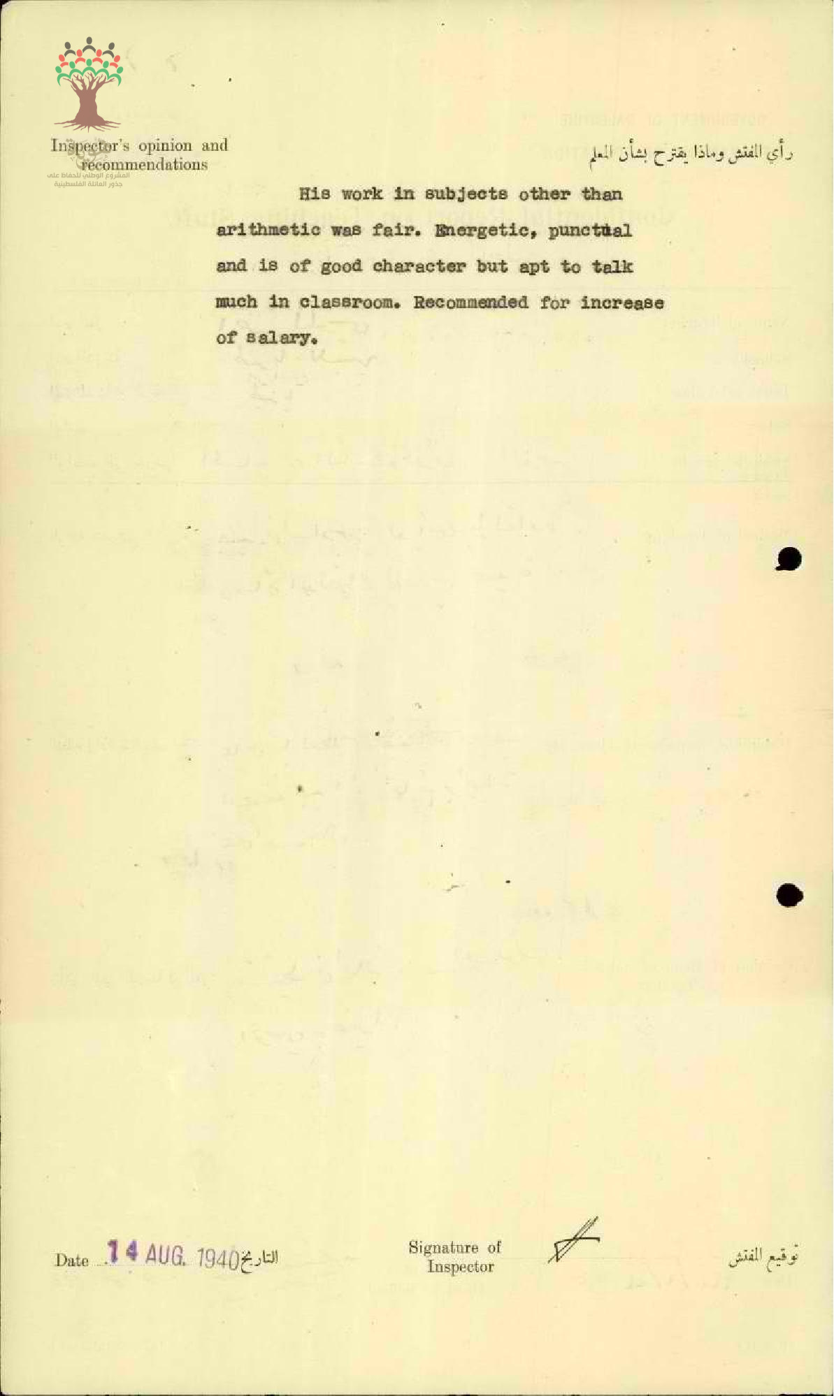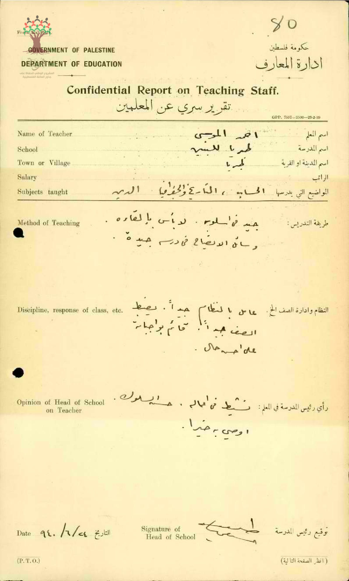 تقرير تفصيلي عن أداء المعلم أحمد موسى في مدرسة طبريا سنة 1940