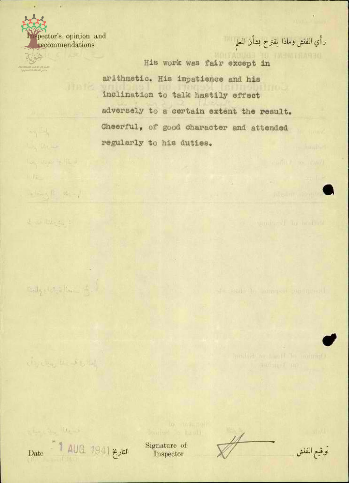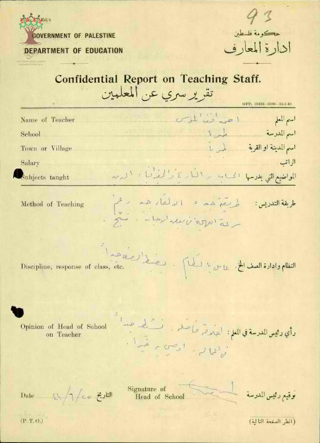 تقرير تفصيلي عن أداء المعلم أحمد موسى في مدرسة طبريا سنة 1941