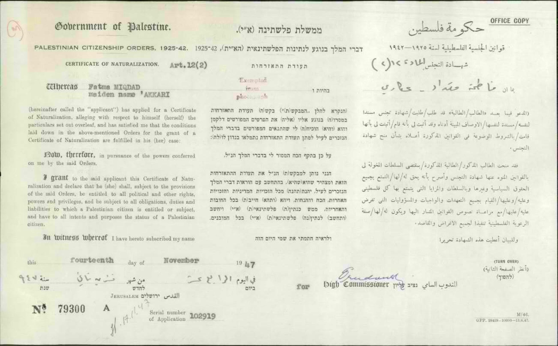 شهادة الجنسية الفلسطينية ل فاطمة عكاري مقداد