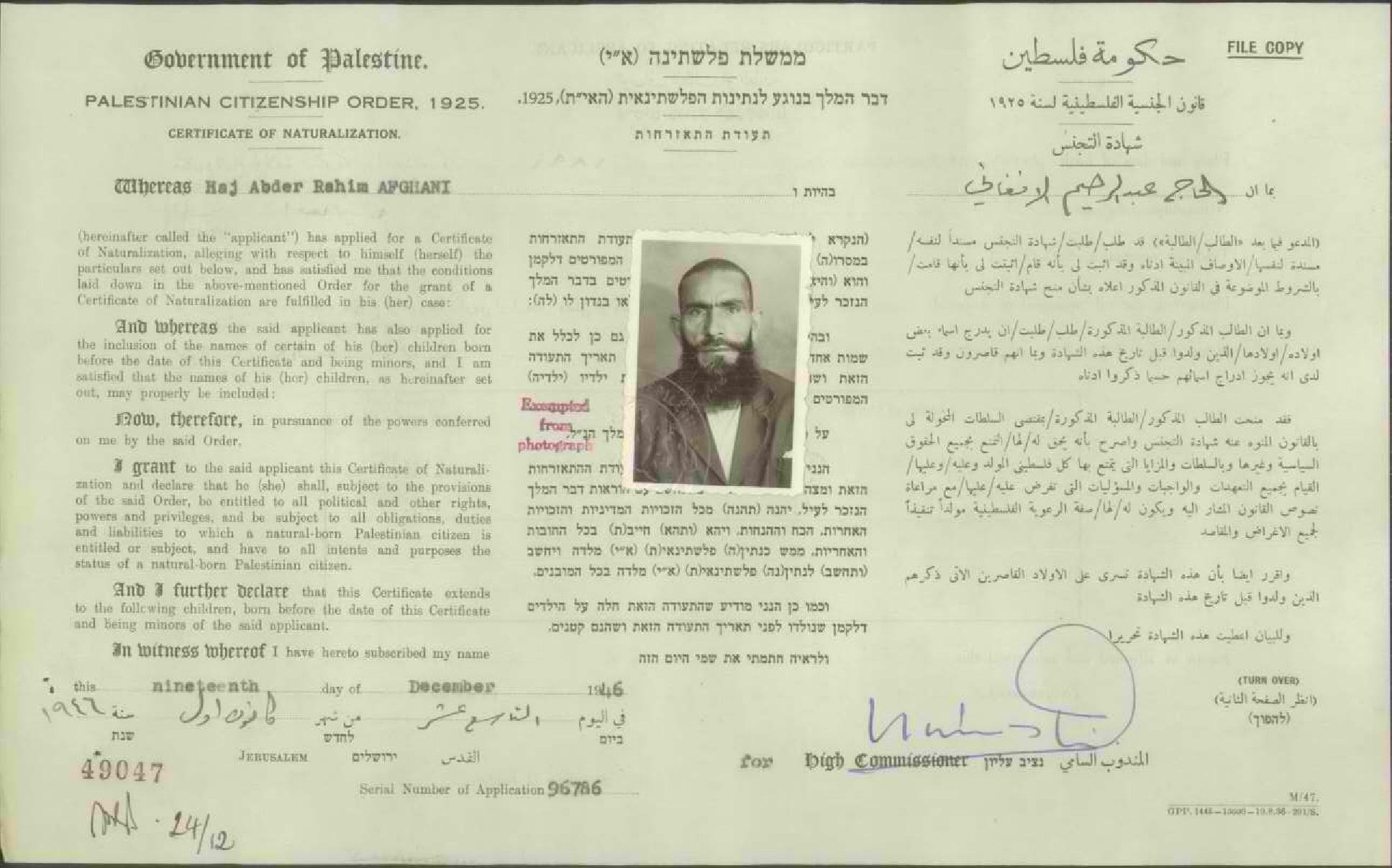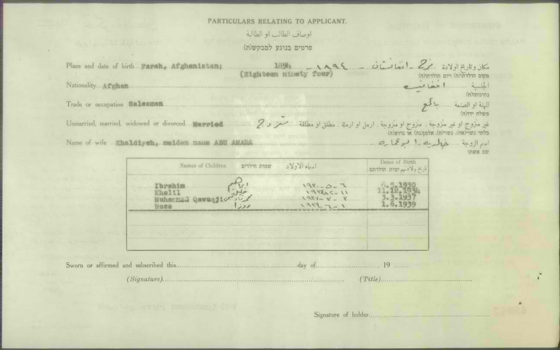 شهادة الجنسية الفلسطينية ل عبد الرحيم الأفغاني