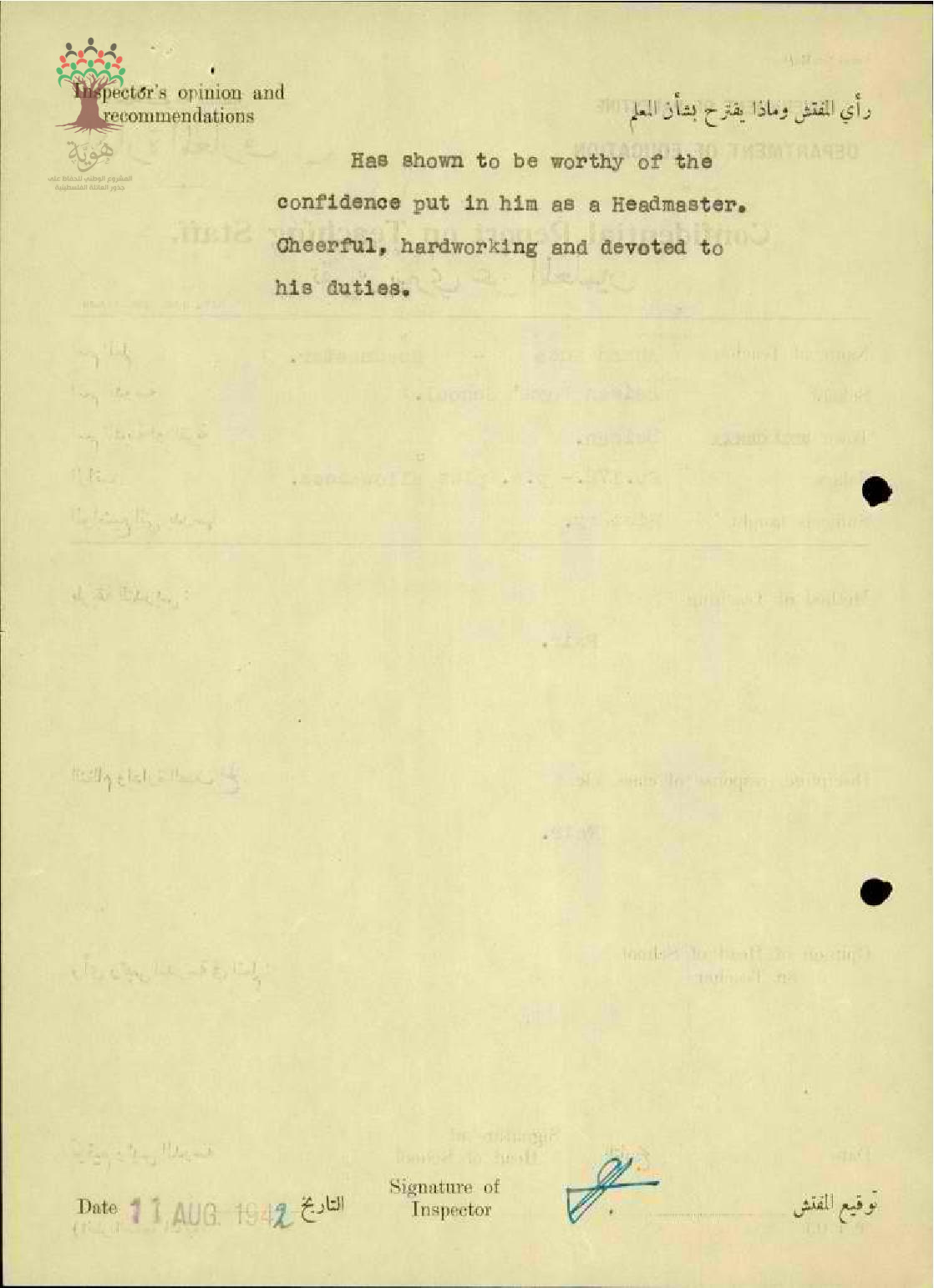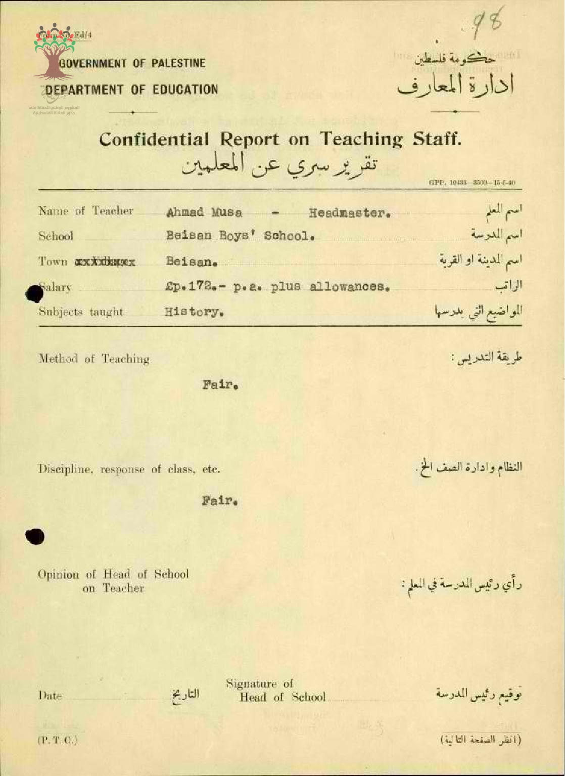 تقرير تفصيلي عن أداء المعلم أحمد موسى في مدرسة بيسان سنة 1942