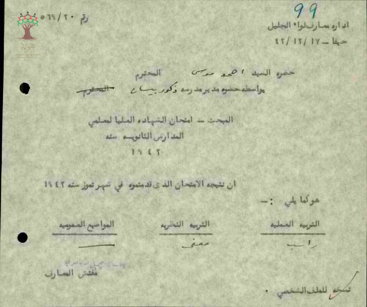 رسالة من مفتش المعارف إلى المعلم أحمد موسى يبحث معه امتحان الشهادة العليا لمعلمي المدارس الثانوية سنة 1942