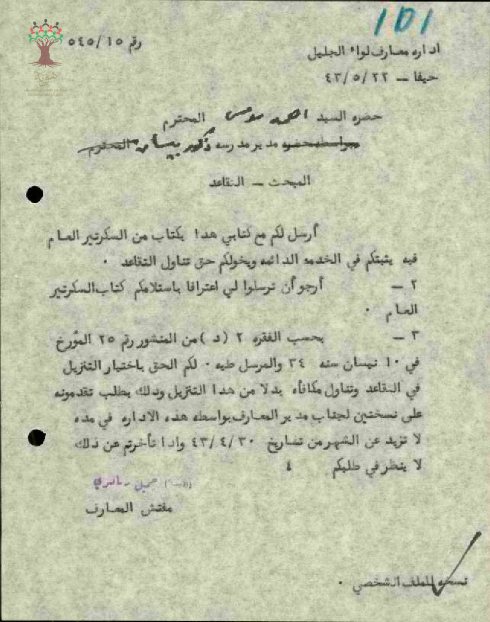 رسالة من مفتش المعارف إلى المعلم أحمد موسى يبحث معه أمر التقاعد و ردّ المعلم أحمد على الرسالة