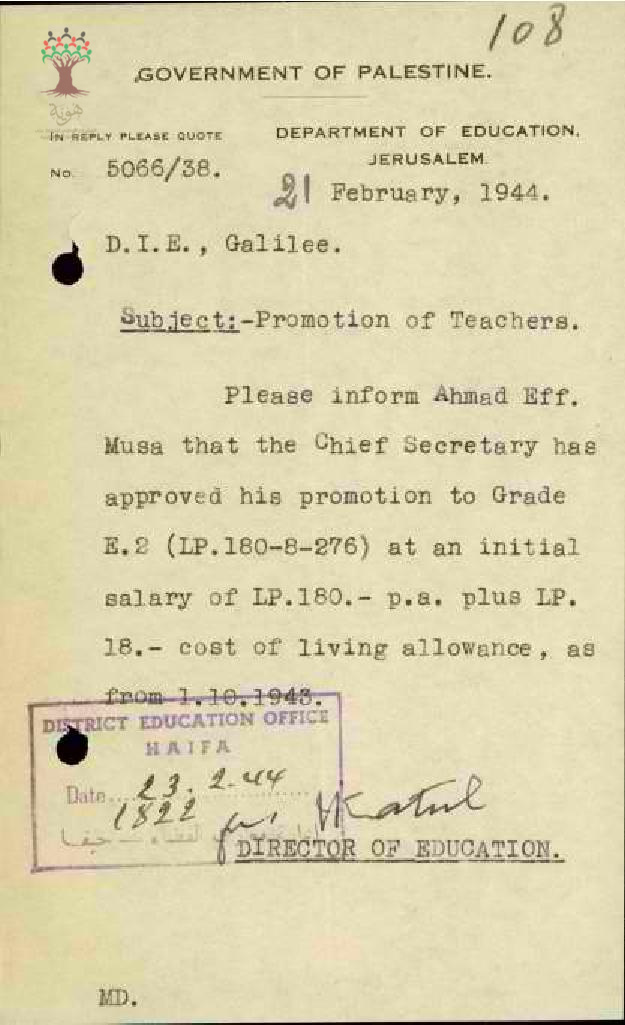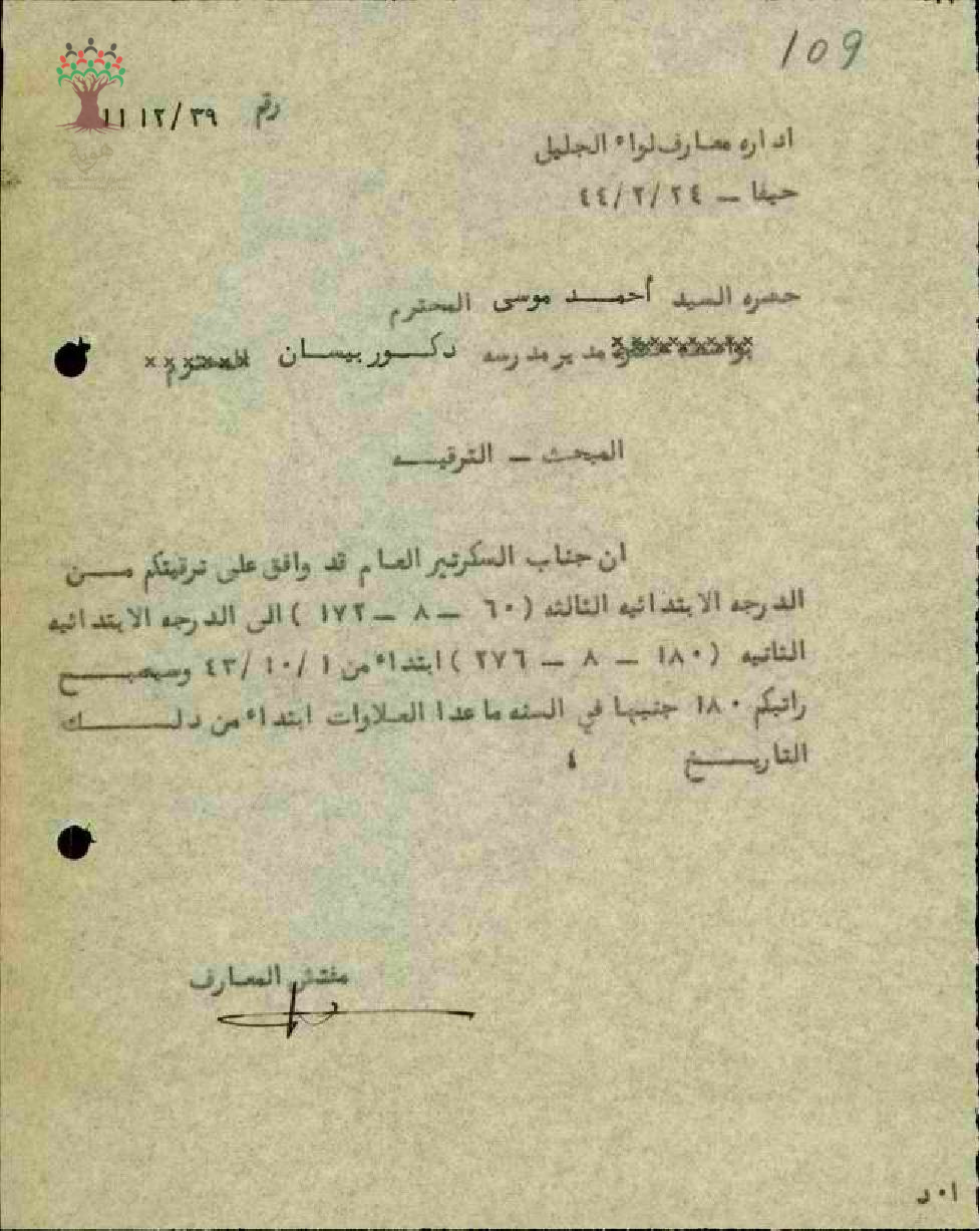 رسالة من مفتش المعارف إلى المعلم أحمد موسى يخبره بموافقة السكرتير العام على ترقيته