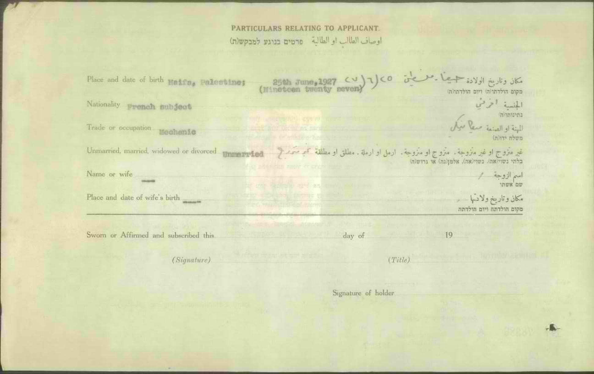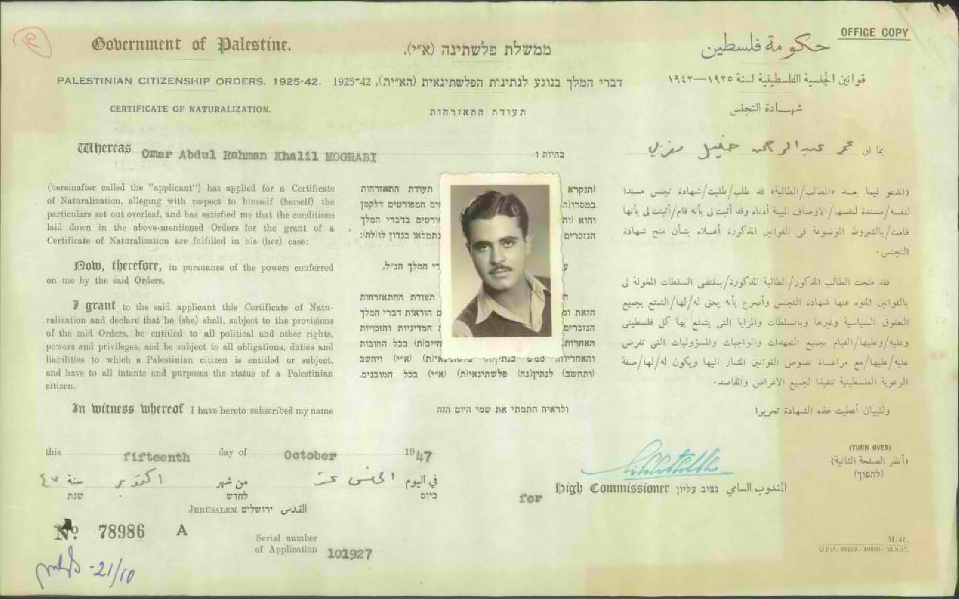 شهادة الجنسية الفلسطينية ل عمر عبد الرحمن خليل مغربي