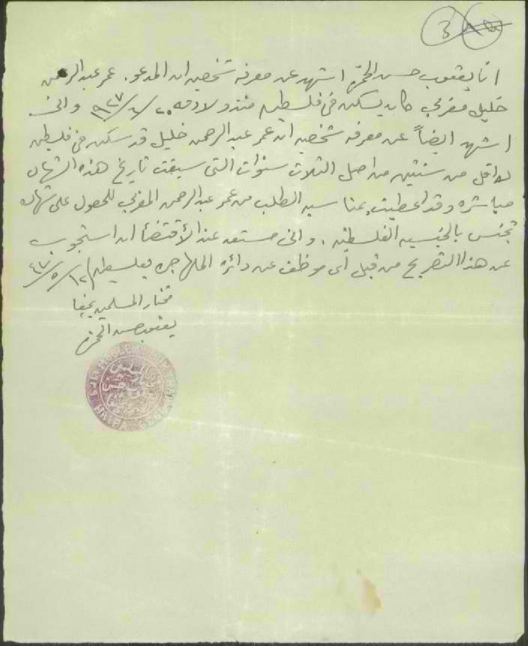 شهادة من مختار المسلمين في حيفا يعقوب حسن الخمرة للسيد عمر عبدالرحمن خليل مغربي بخصوص طلب الجنسية/حيفا