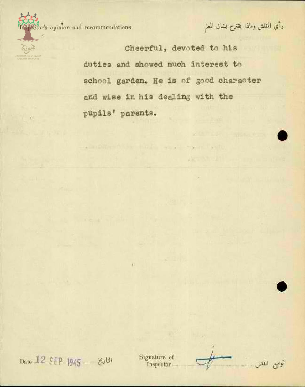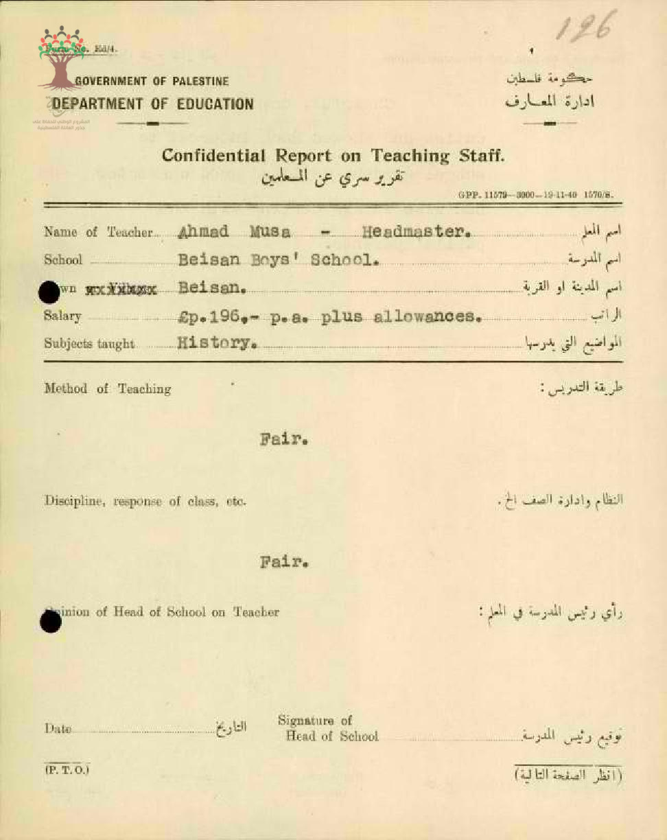 تقرير تفصيلي عن أداء المعلم أحمد موسى في مدرسة بيسان سنة 1945