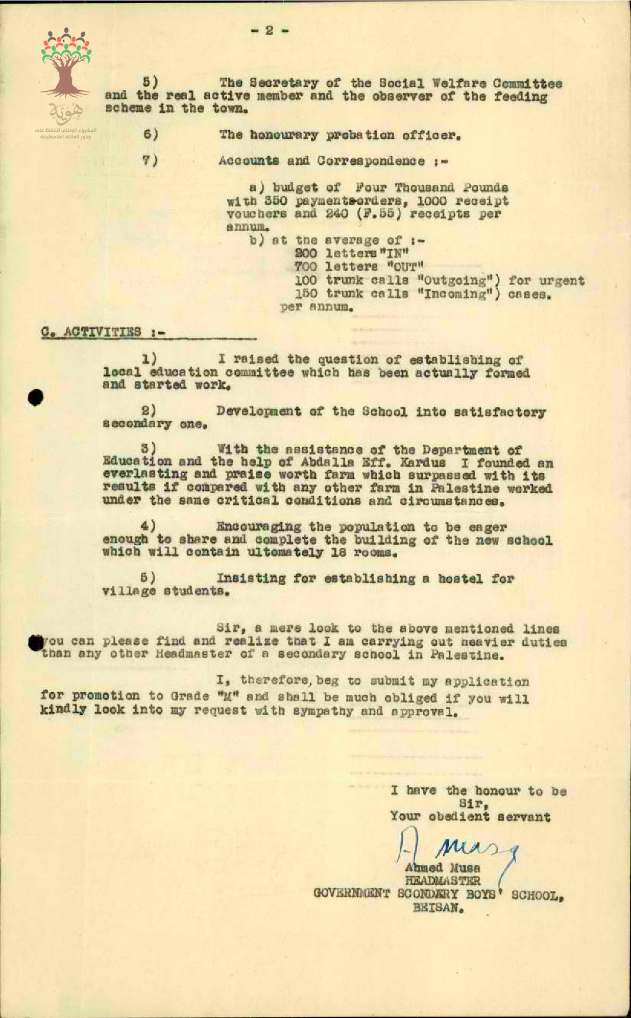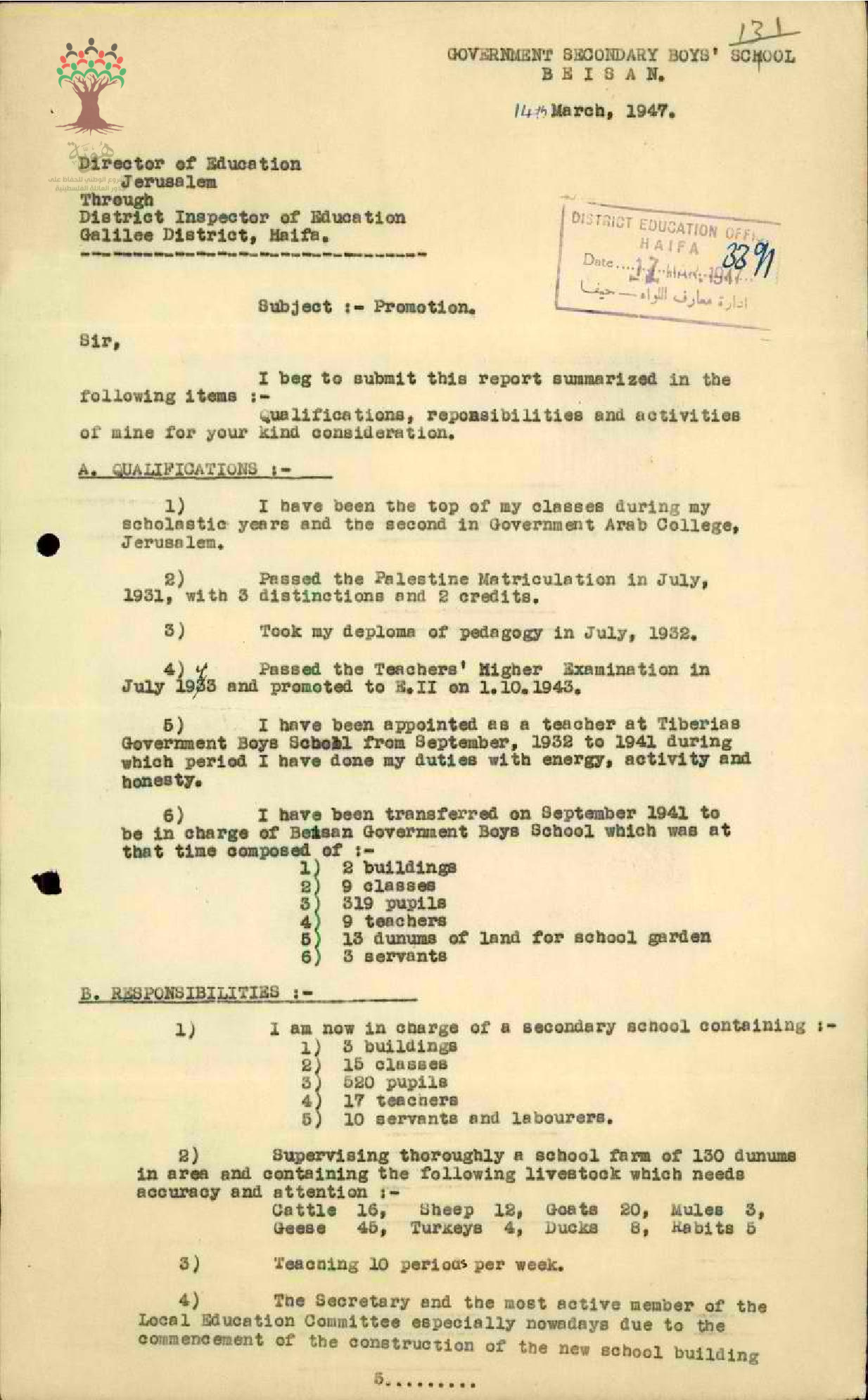 رسالة من المعلم أحمد موسى إلى مفتش المعارف يبحث فيها أمر الترقية سنة 1947