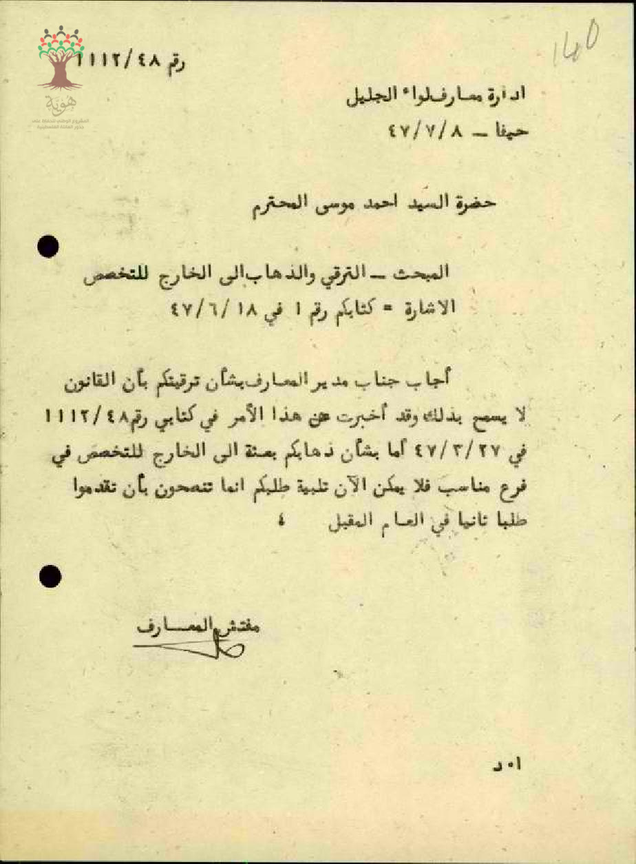 رسالة من مدير المعارف إلى مفتش المعارف يخبره عن أسفه بعدم امكانية ارسال المعلم أحمد موسى إلى الخارج للتخصص