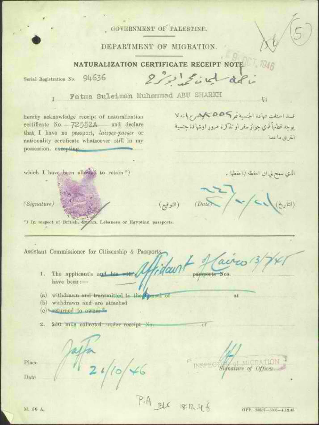 إيصال موقع من فاطمة أبو شرخ باستلام شهادة الجنسية الفلسطينية