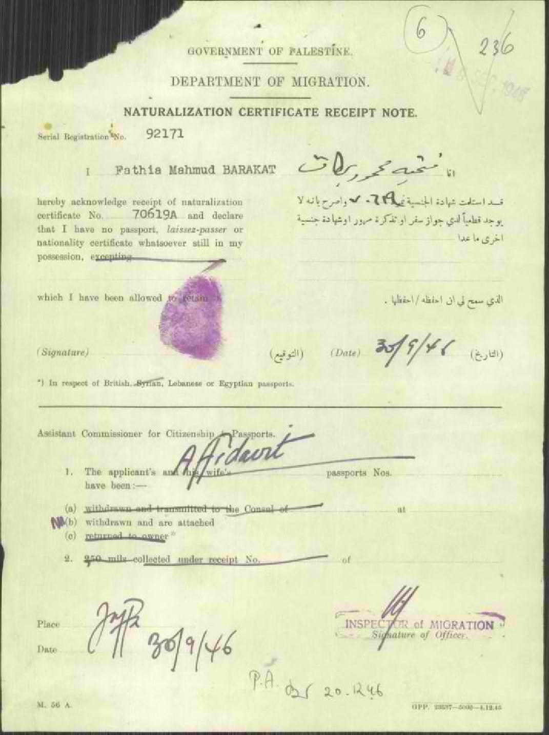إيصال موقع من فتحية امبابي بركات باستلام شهادة الجنسية الفلسطينية