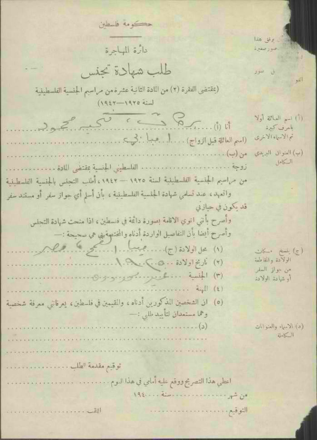طلب الجنسية الفلسطينية-فتحية امبابي بركات-يازور/مصر