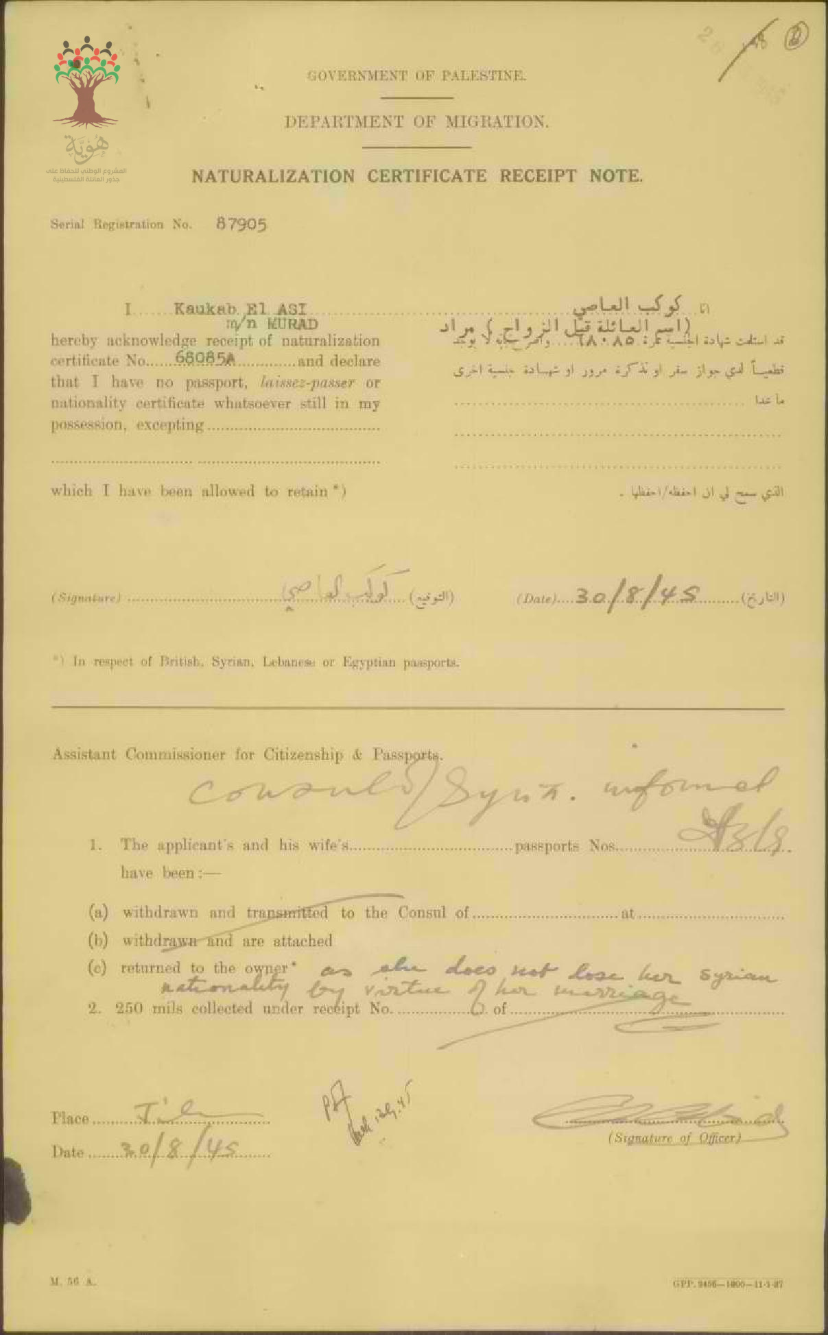 إيصال موقع من كوكب مراد العاصي باستلام شهادة الجنسية الفلسطينية