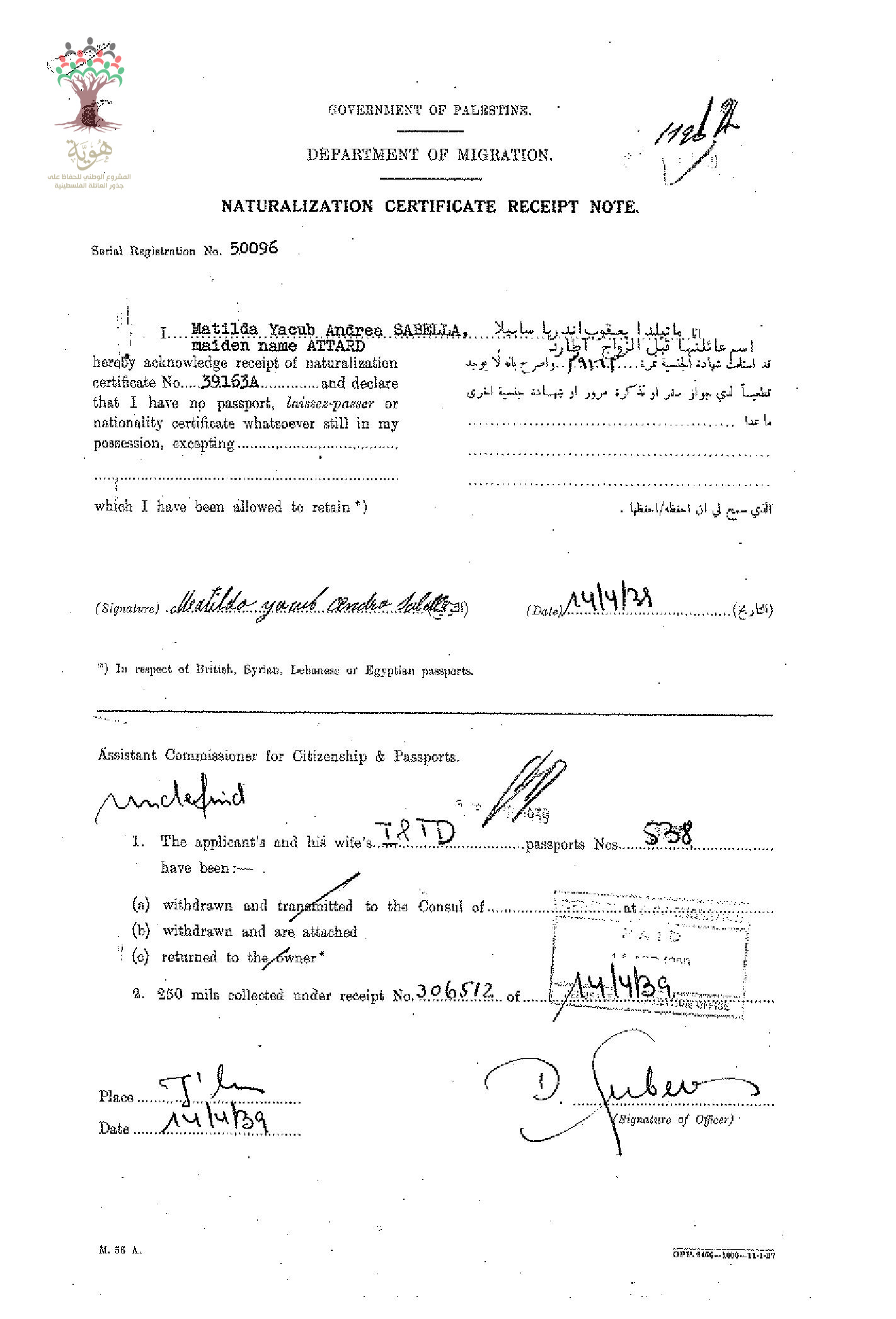 إيصال موقع من ماتيلدا عطارد سابيلا باستلام شهادة الجنسية الفلسطينية