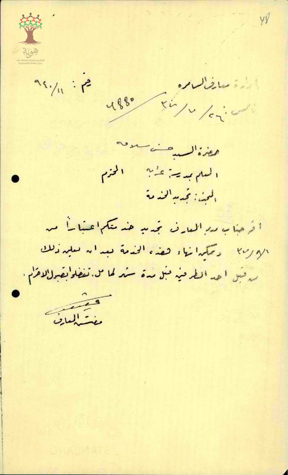 رسالة من مفتش المعارف إلى المعلم حسن سلامة يعلمه بتجديد خدمته في الإدارة