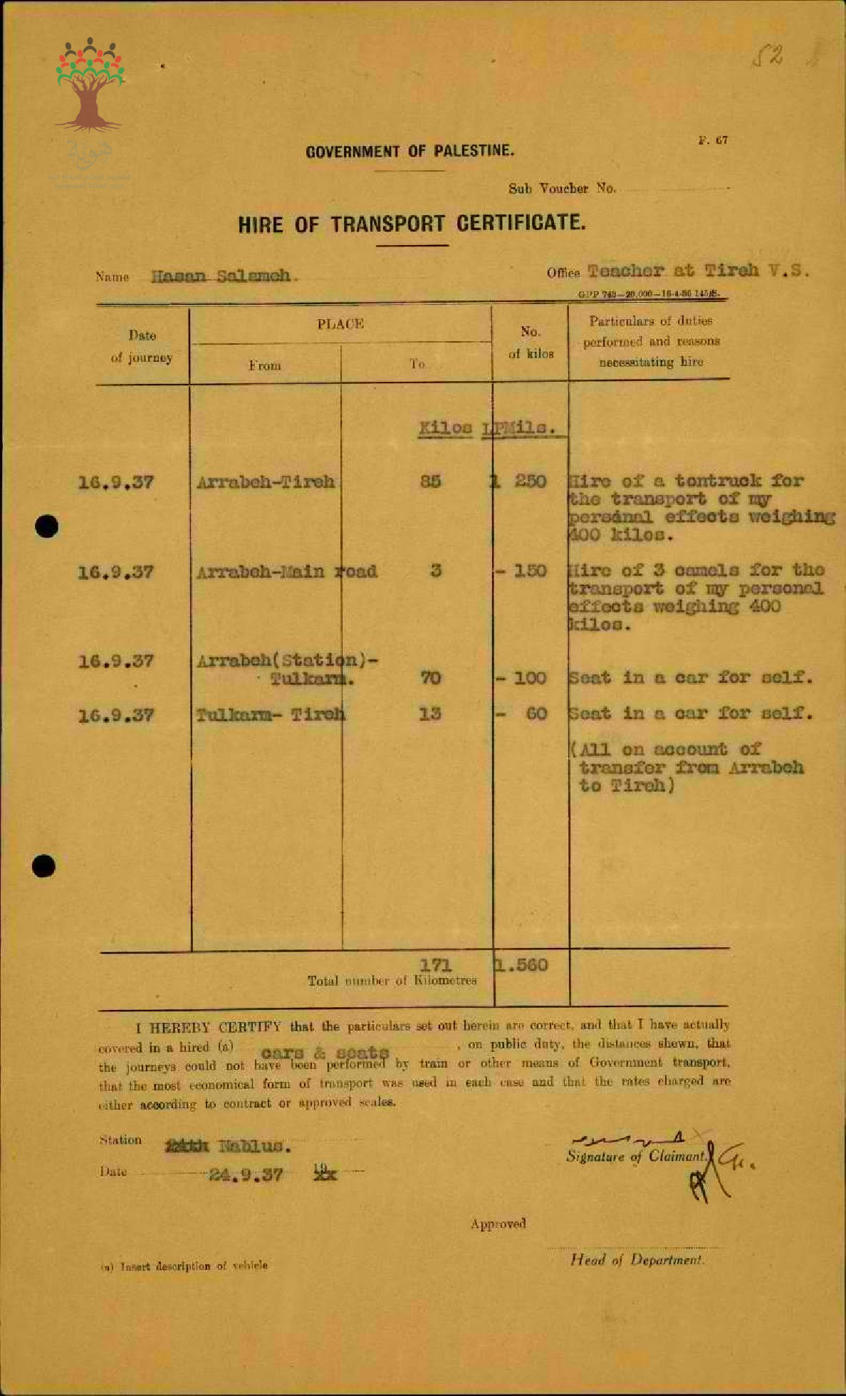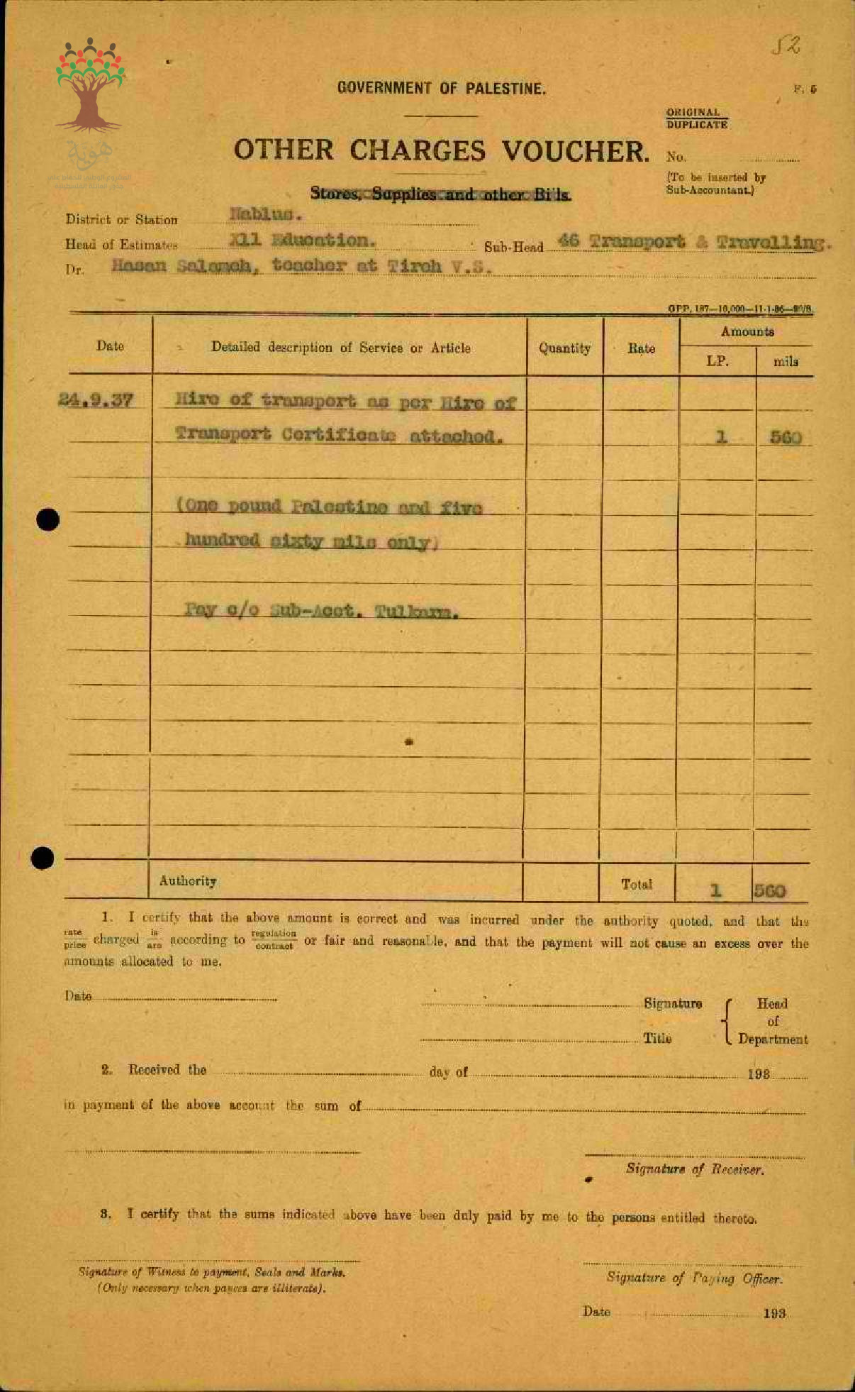 رسالة من المعلم حسن سلامة إلى مفتش المعارف يطلب تحويل أجرة نقل الأثاث والسفر إلى البنك الزراعي العربي بطولكرم