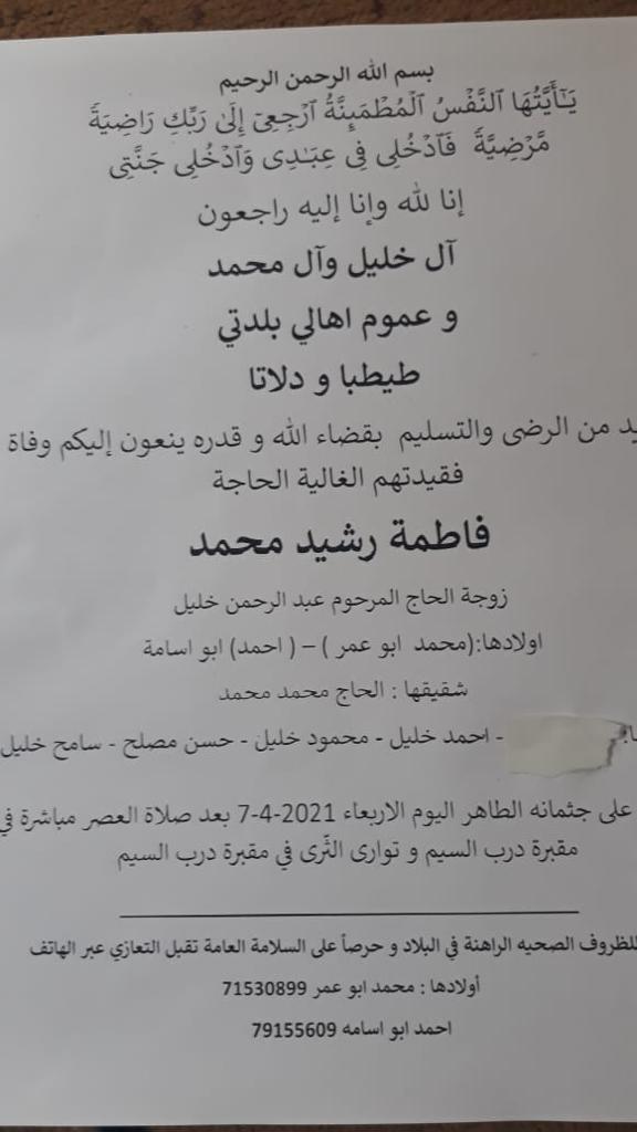 وثيقة وفاة- للحلجة فاطمة رشيد محمد عبدالله - دلاته قضاء صفد