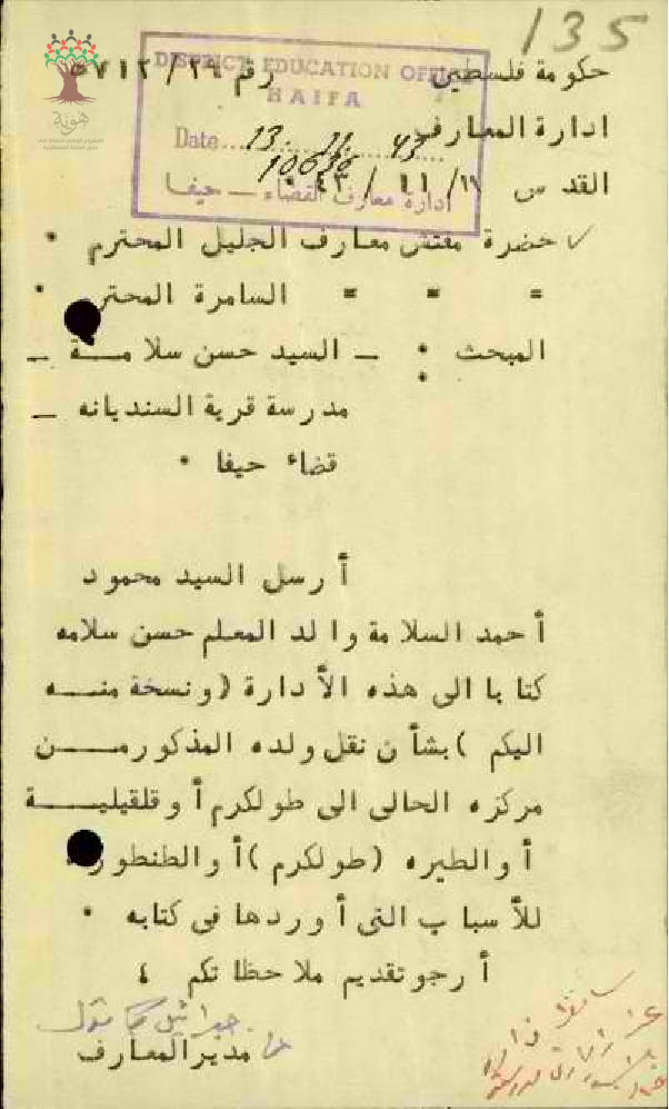رسالة من مدير المعارف إلى مفتش المعارف يخبره بإرسال والد المعلم حسن سلامة طالباً نقل ابنه من مدرسة السنديانة مع ذكر الأسباب
