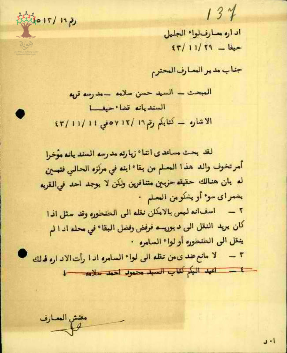 رسالة من مفتش المعارف إلى مدير المعارف يعلمه نتيجة زيارة مساعده إلى مدرسة السنديانة بخصوص المعلم حسن سلامة