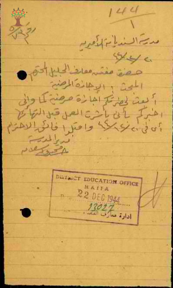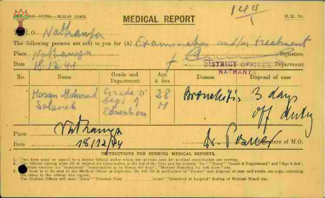 رسالة من المعلم حسن سلامة إلى مفتش المعارف يعلمه بالإجازة المرضية مرفقاً التقرير الطبي