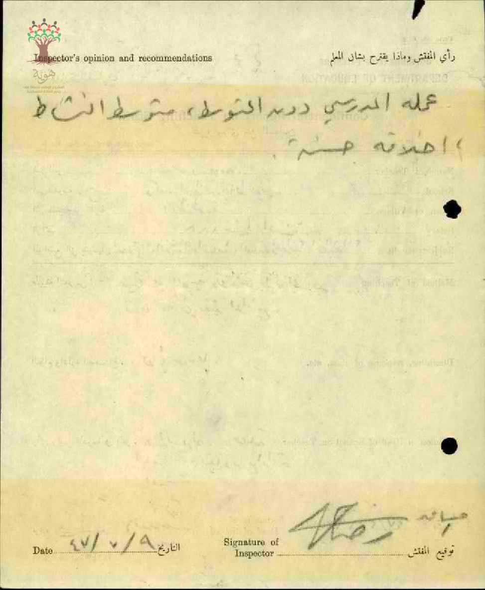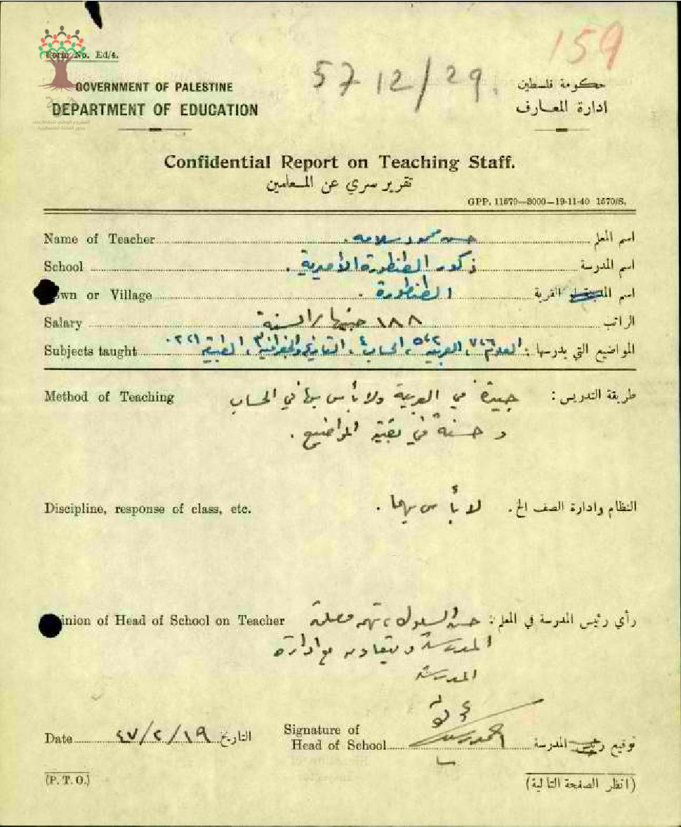 تقرير تفصيلي عن أداء المعلم حسن سلامة في مدرسة الطنطورة سنة 1947