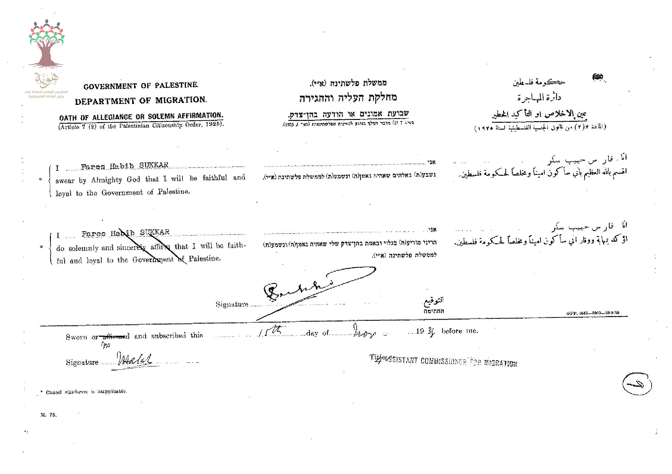 فارس سكر يوقع على (يمين الإخلاص) للحصول على الجنسية الفلسطينية