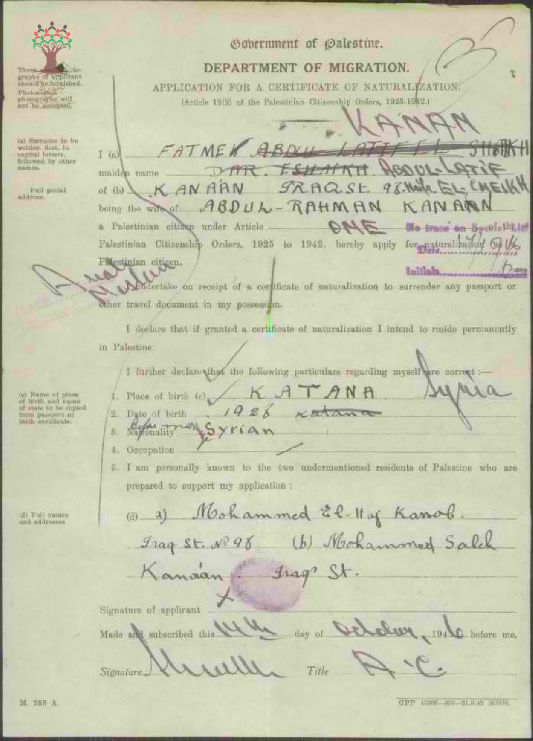 طلب الجنسية الفلسطينية-فاطمة الشيخ كنعان-حيفا/سوريا