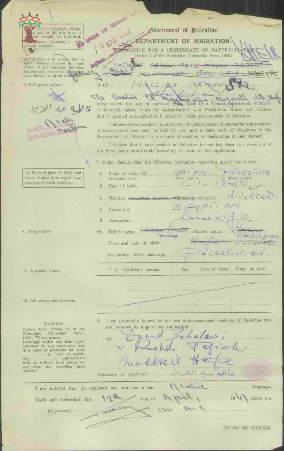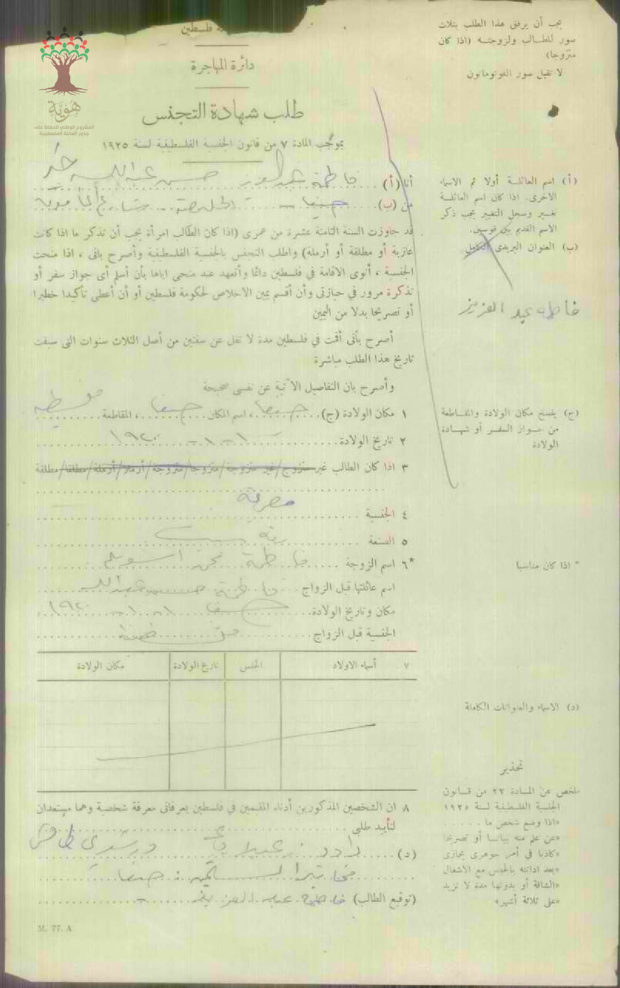 طلب الجنسية الفلسطينية-فاطمة عبد الله خير-حيفا/مصر