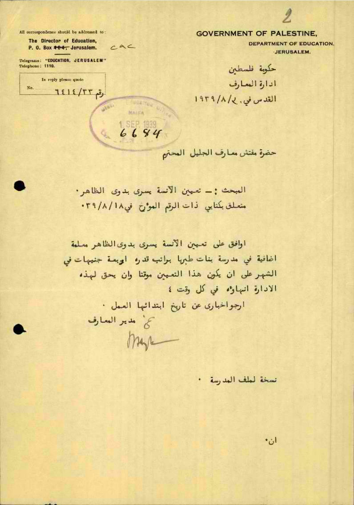 رسالة من مدير المعارف إلى مفتش المعارف يبحث فيها تعيين المعلمة يسرى ظاهر في مدرسة طبريا