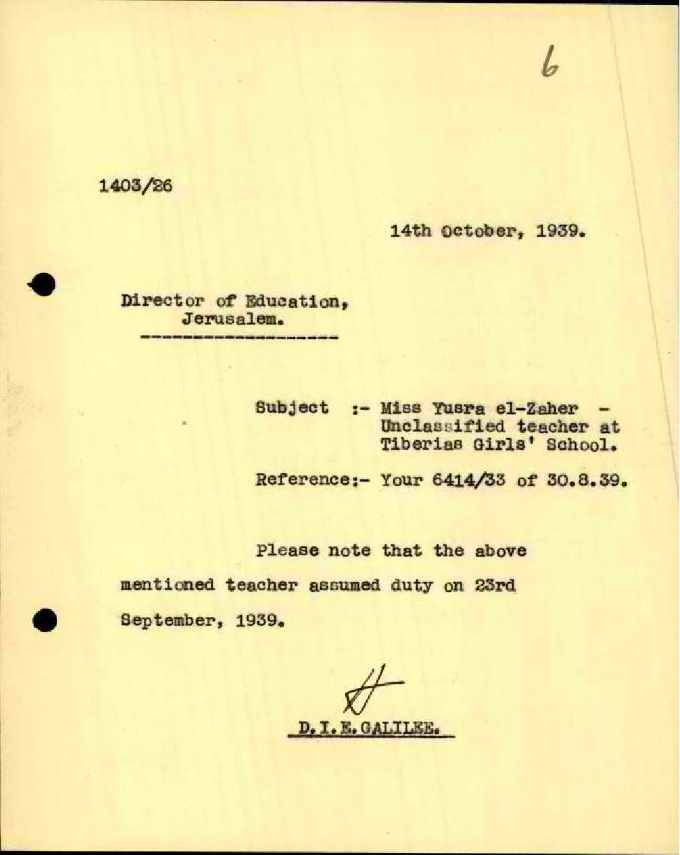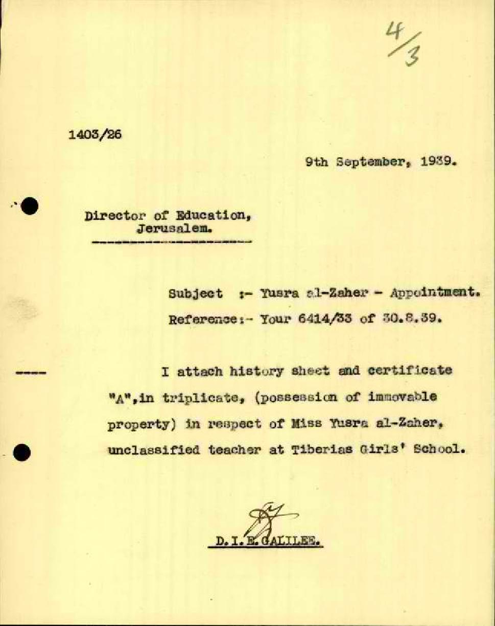 رسالة من مفتش المعارف إلى مدير المعارف يبحث فيها تعيين المعلمة يسرى ظاهر معلمة غير نظامية في مدرسة طبريا
