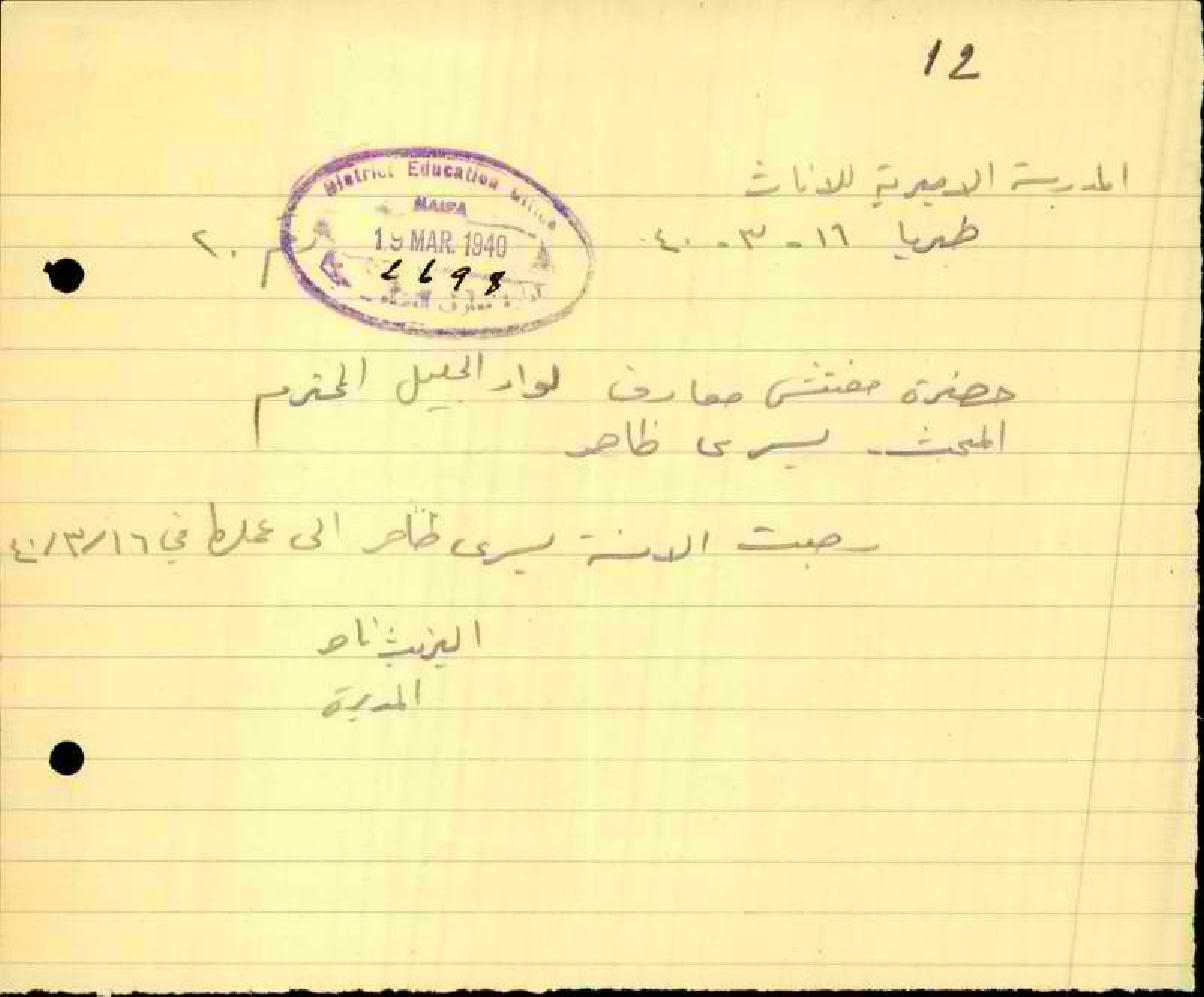 رسالة من مديرة مدرسة طبريا إلى مفتش المعارف تخبره بعودة المعلمة يسرى ظاهر إلى العمل في 16/3/1940