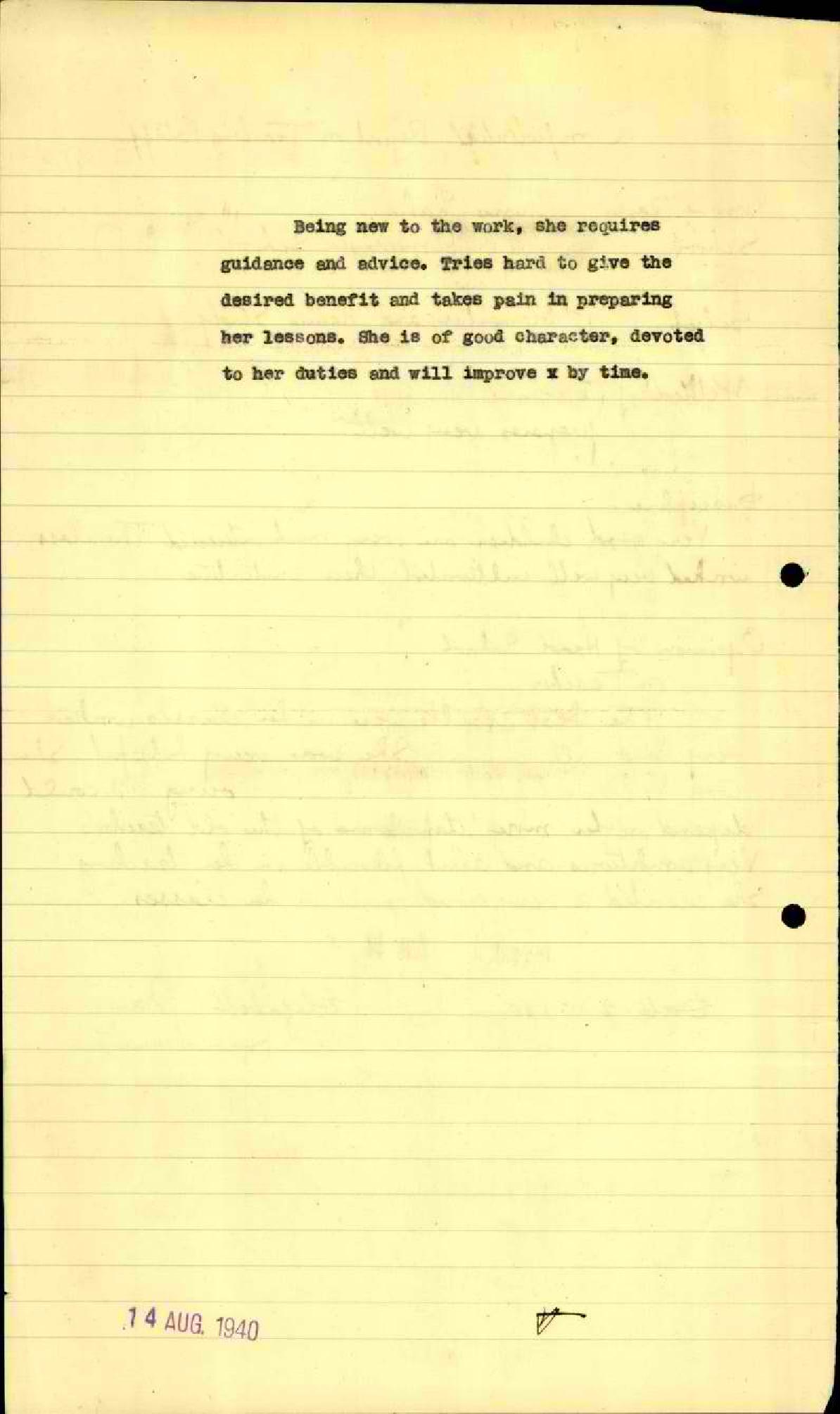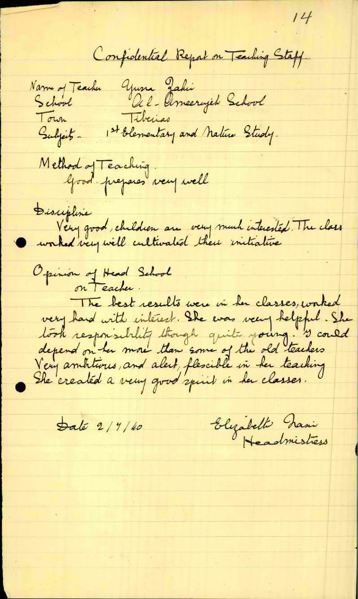 تقرير تفصيلي عن أداء المعلمة يسرى ظاهر في مدرسة طبريا سنة 1940