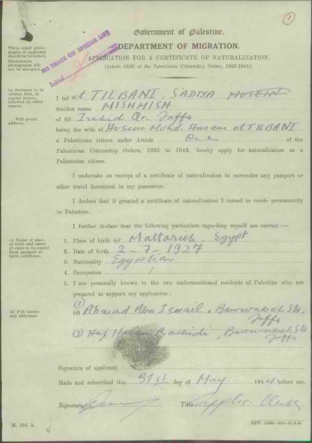 طلب الجنسية الفلسطينية-سعدية مشمش التلباني-يافا/مصر