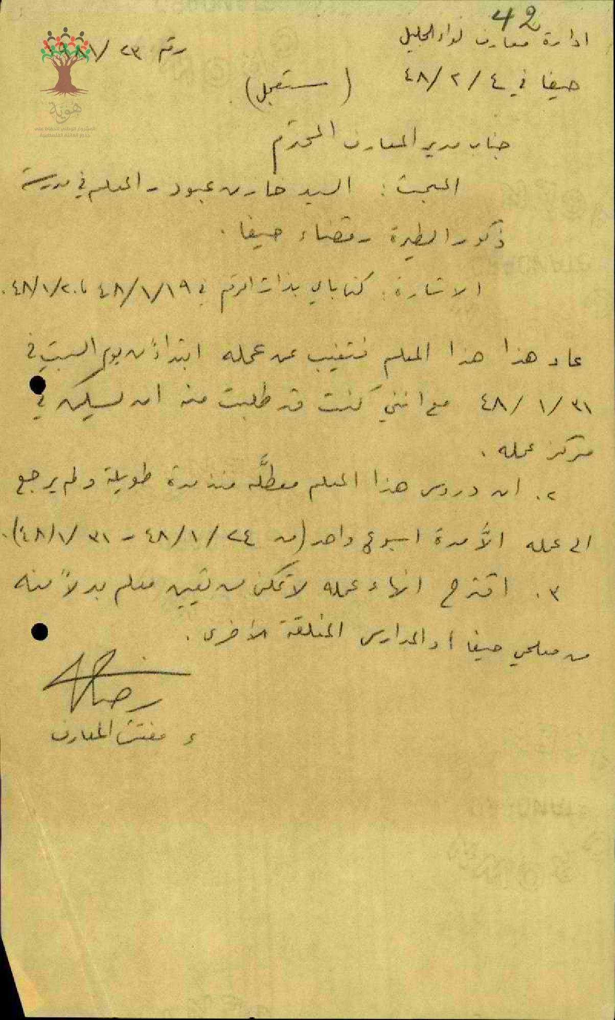 رسالة من مفتش المعارف إلى مدير المعارف يبحث معه أمر غياب المعلم خازن عبود وتوقف دروسه واقتراح انهاء عمله