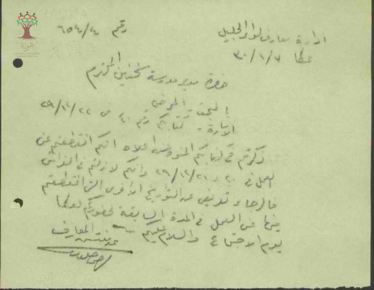 رسالة من مفتش المعارف إلى المعلم نمر عبود يبحث معه أمر مرضه وتاريخ الانقطاع عن العمل